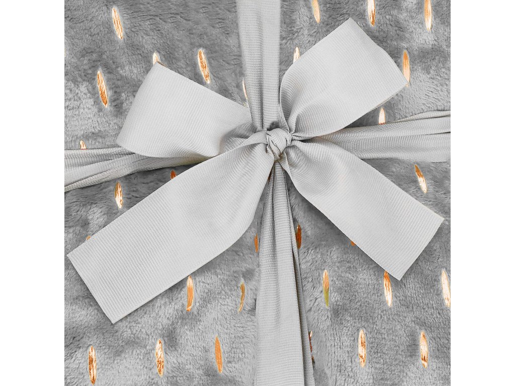 - Pătura este înfășurată cu o panglică gri elegantă