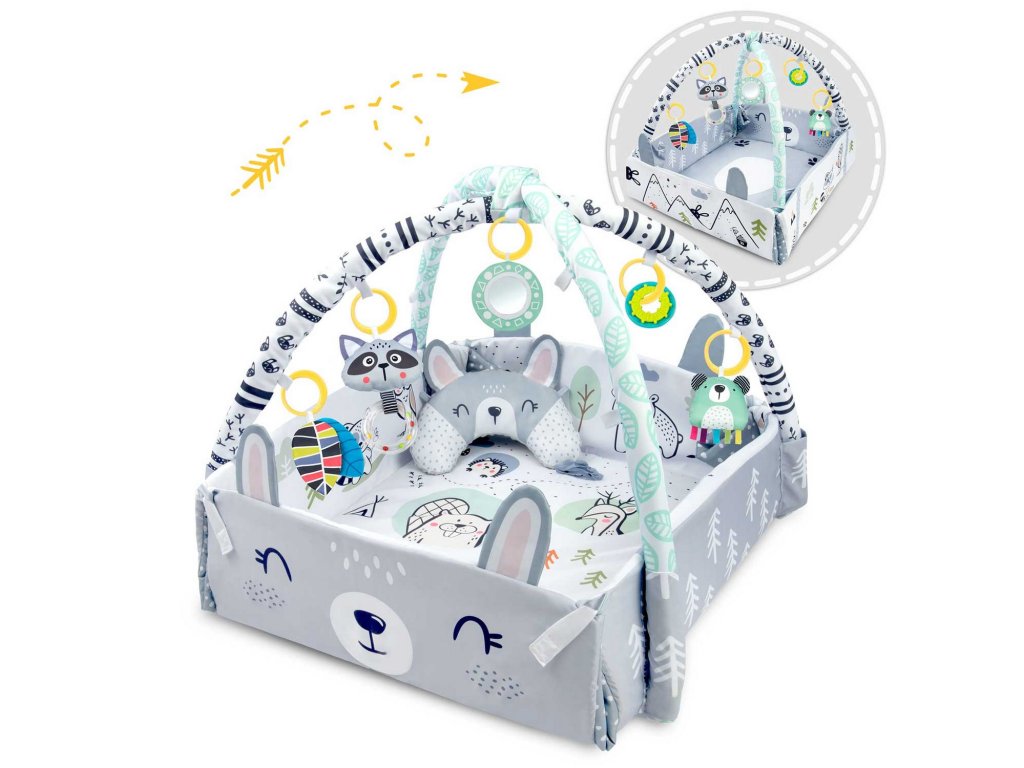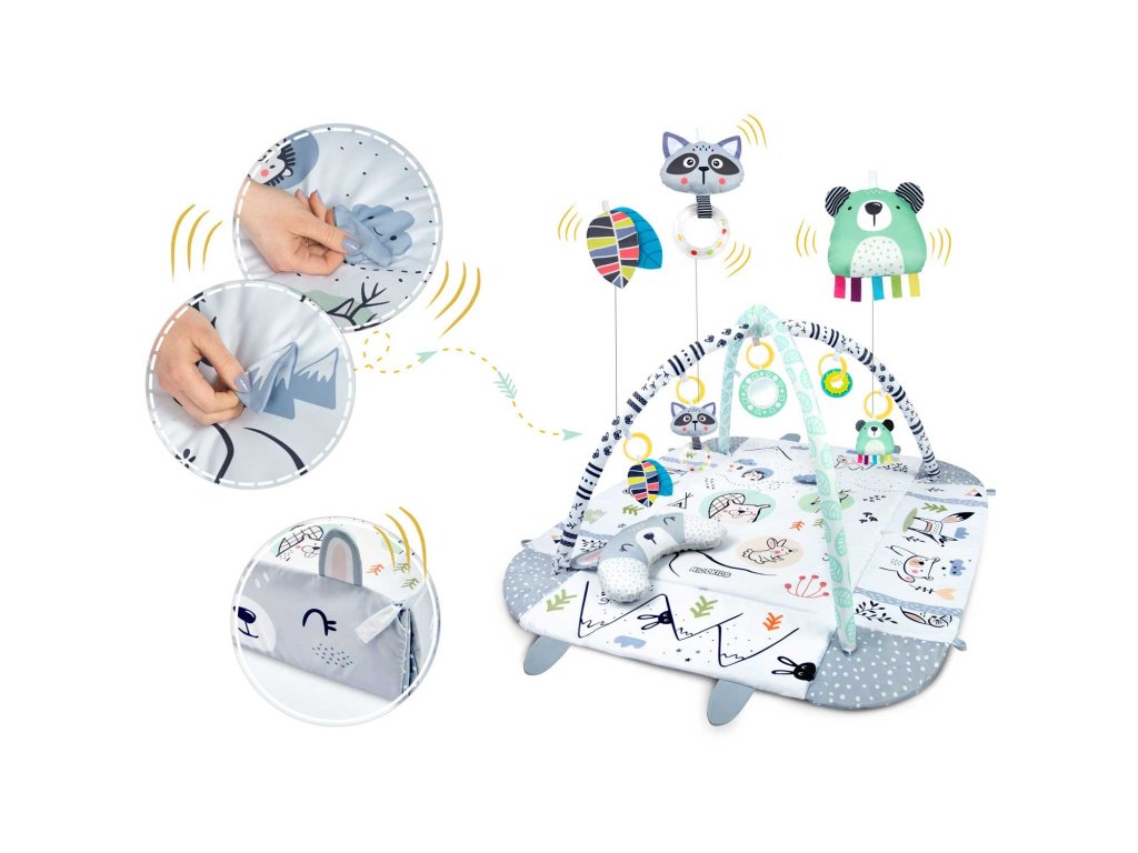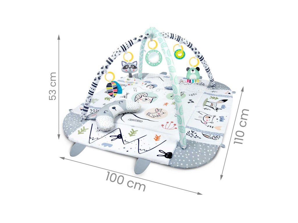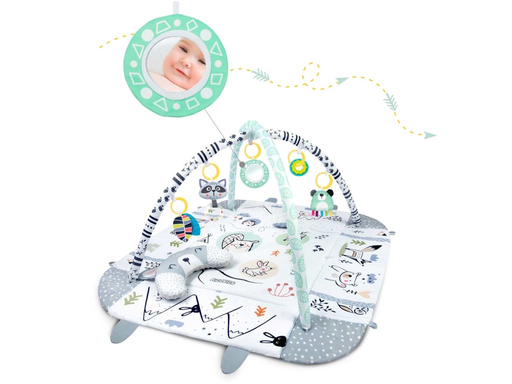 - Setul include: covoraș, 4 laterale, 2 arcade, 7 jucării multifuncționale, pernă.