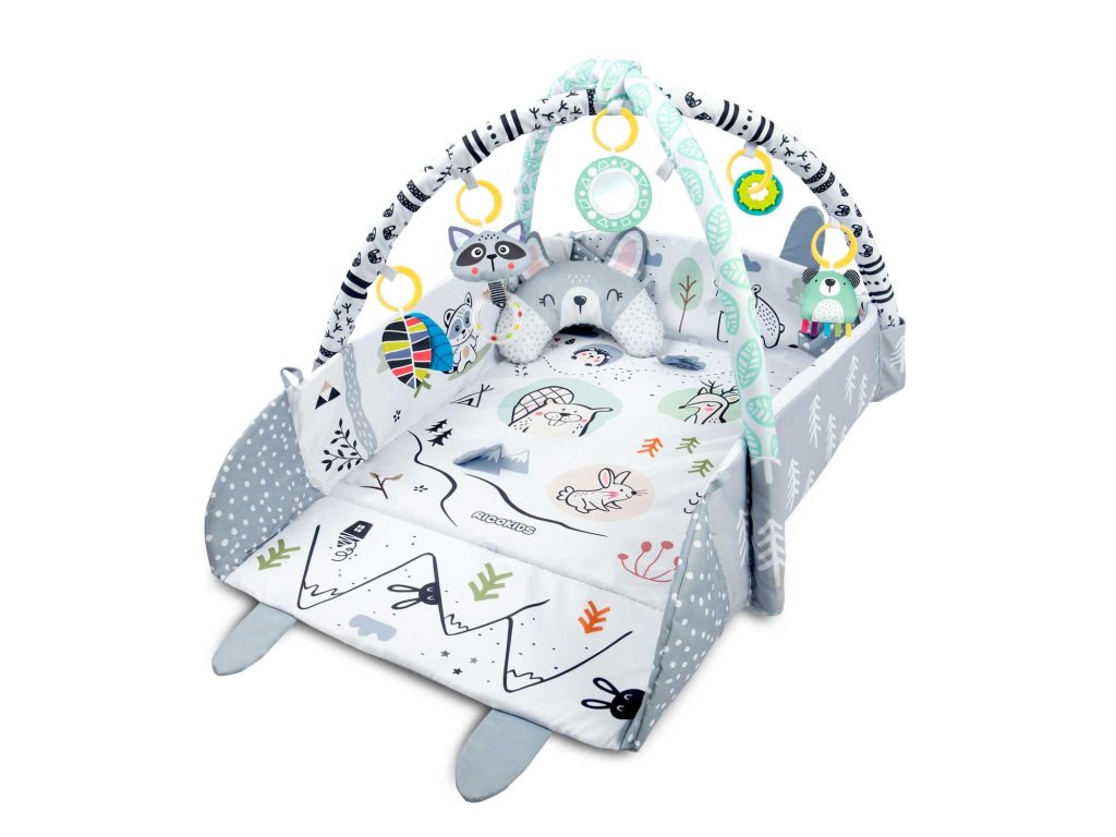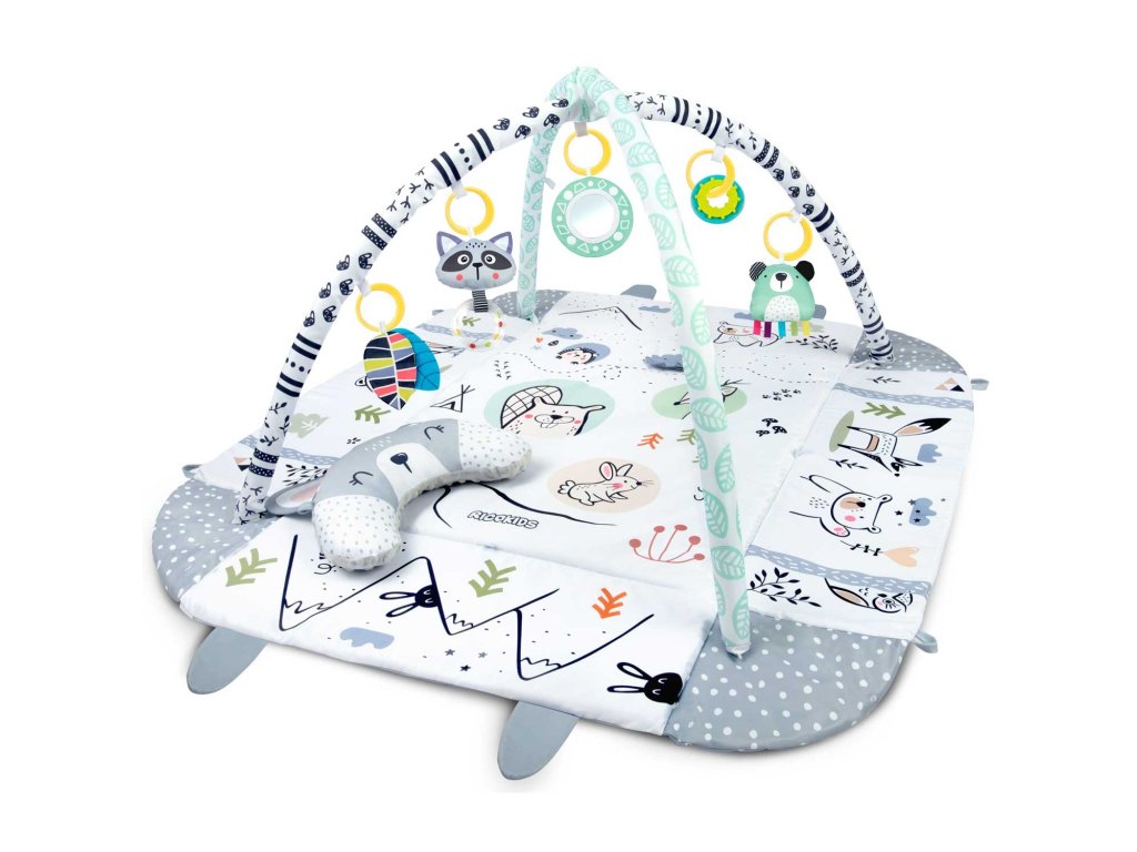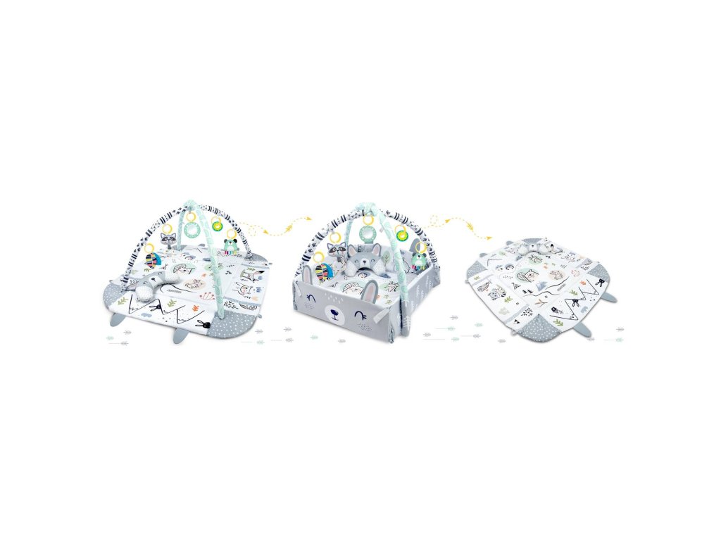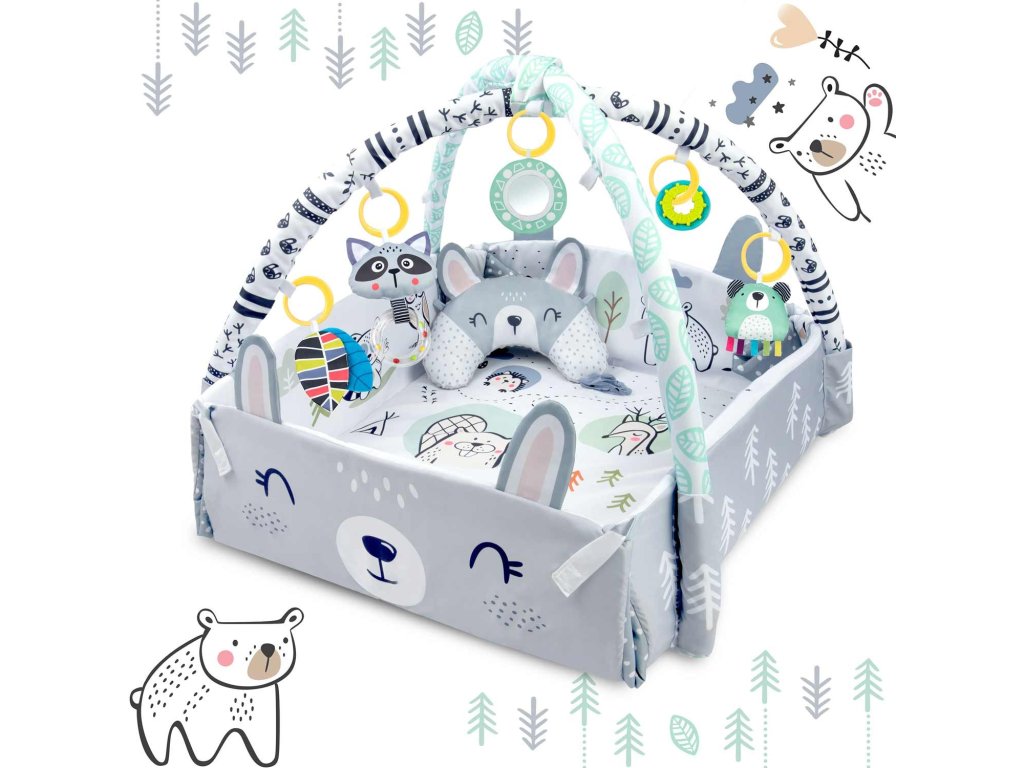 - Setul include: covoraș, 4 laterale, 2 arcade, 7 jucării multifuncționale, pernă.
