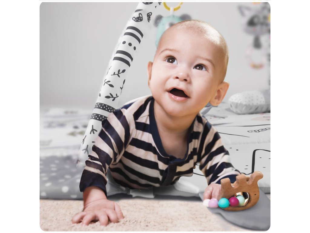 De aceea am adăugat jucării multifuncționale la covoraș, pe care le puteți agăța de arcade - să aibă ceva care să zăngănească și ceva care să foșnească! Jucăriile conțin chiar și o jucărie care piuie - ursuleț cu panglici senzoriale!
