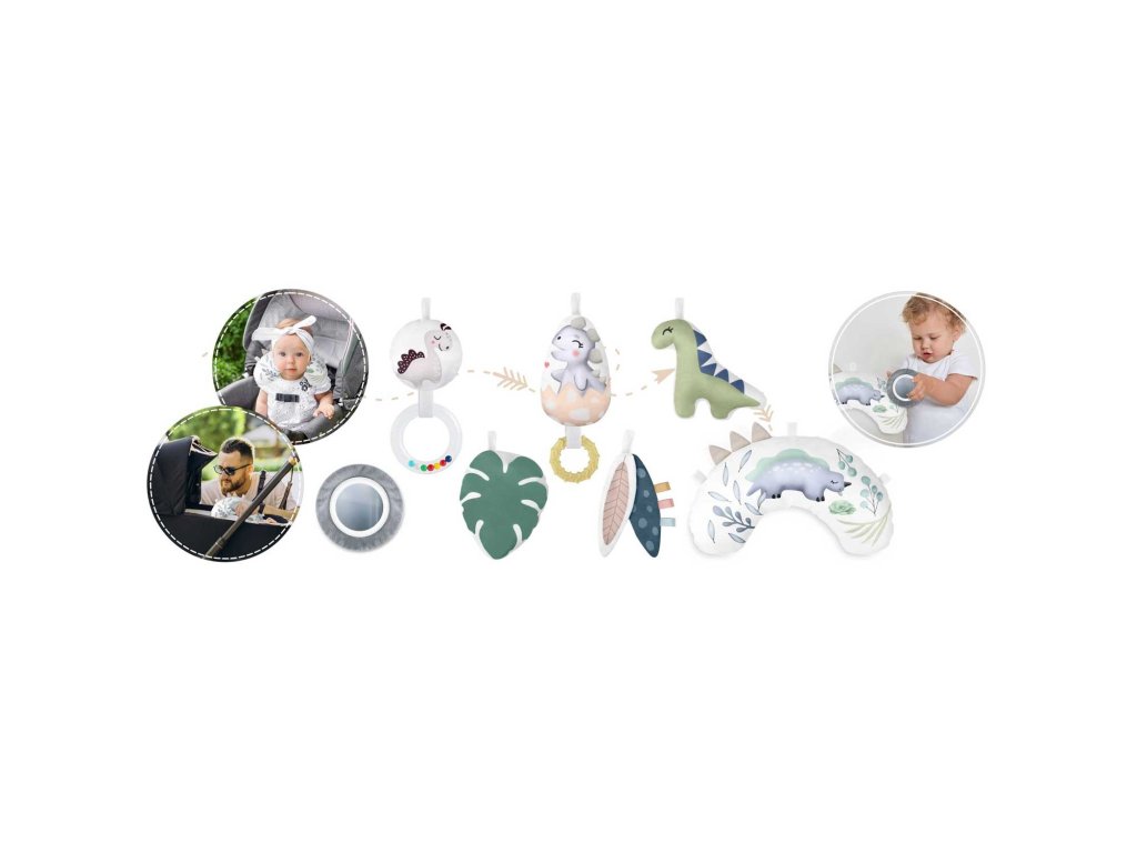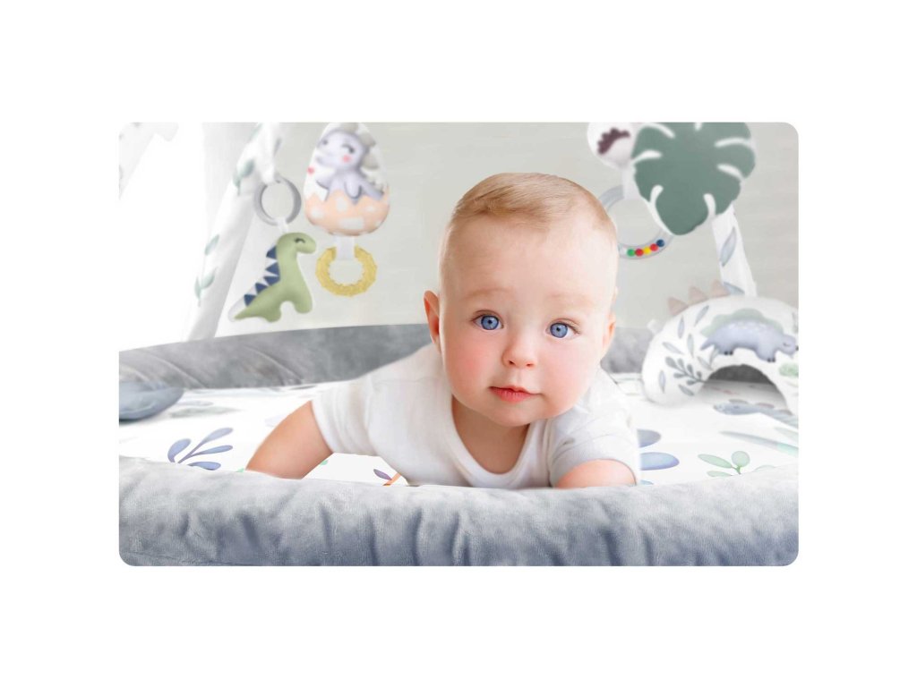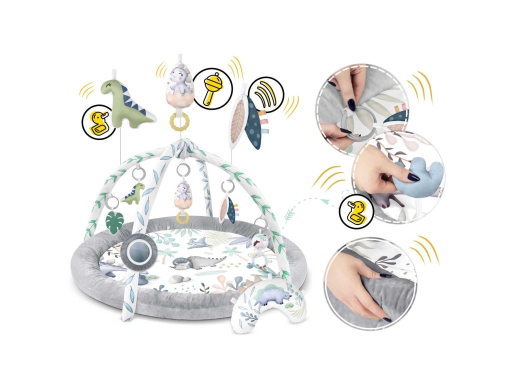 De aceea, am inclus în covoraș jucării multifuncționale pe care le puteți agăța de arcuri - lăsați-le să zăngăne, să sune, să foșnească! Dintre jucării face parte chiar și o jucărie care piuie - un dinozaur și o fosilă!