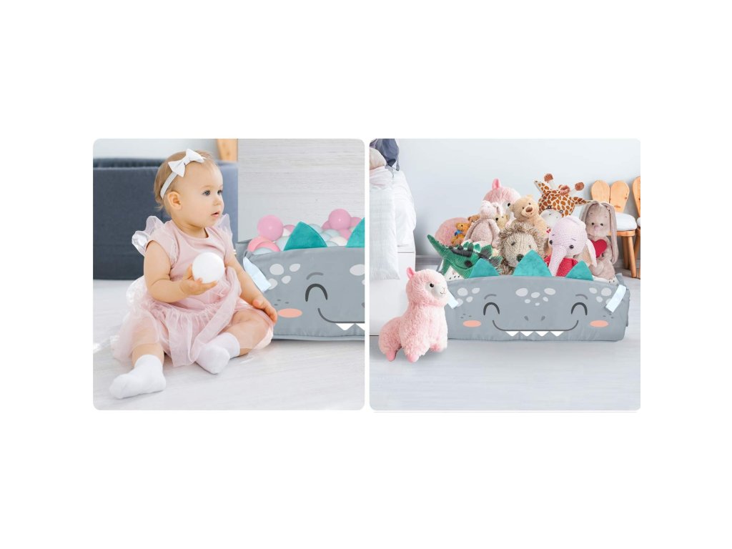 Partea din spate a pernei este acoperită cu un material minky foarte plăcut și fin. Pe pernă se pot atașa jucării, iar dinozaurul foșnește!