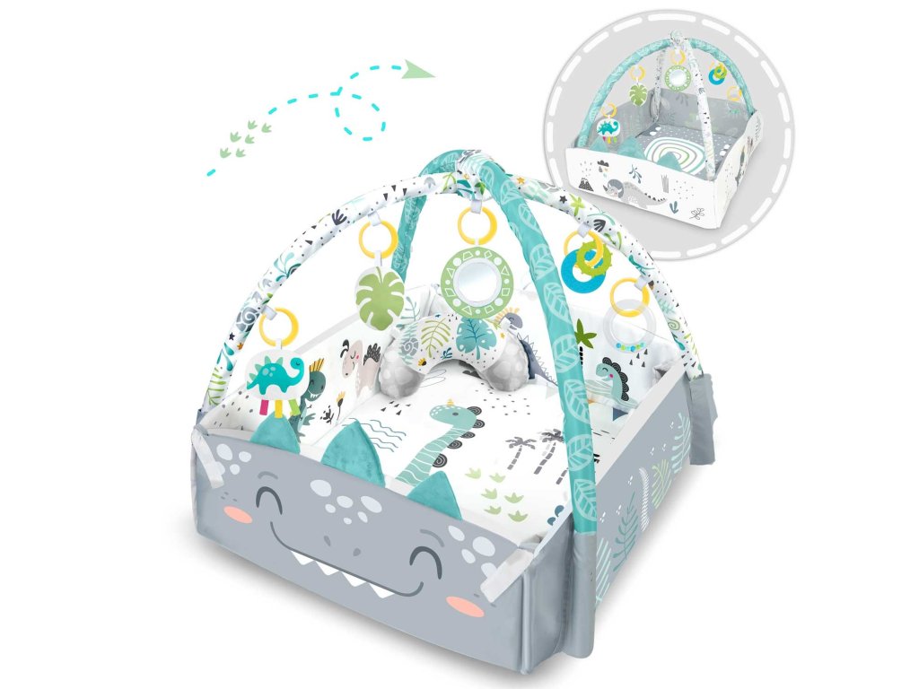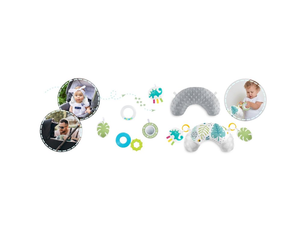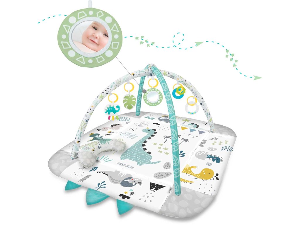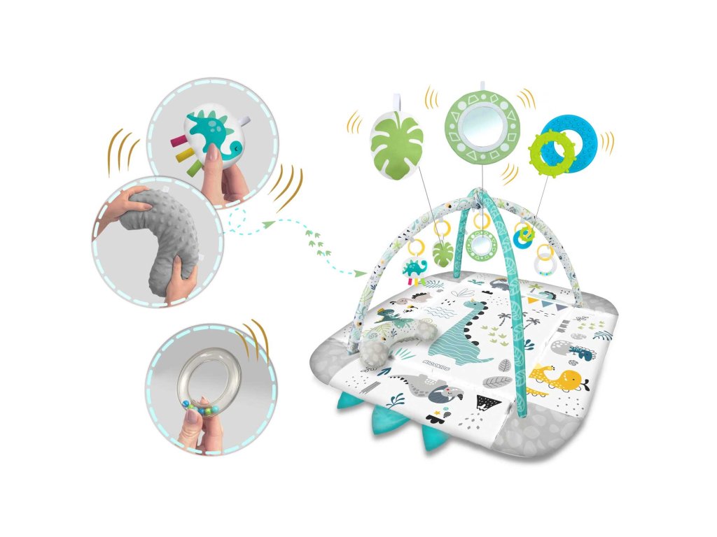 De aceea am inclus jucării multifuncționale care pot fi atârnate de arcadele covorașului - zdrăngănitul sau foșnetul atrag atenția și curiozitatea copilului. Este disponibilă și o jucărie care țipă și un dinozaur cu panglici care stimulează atingerea!