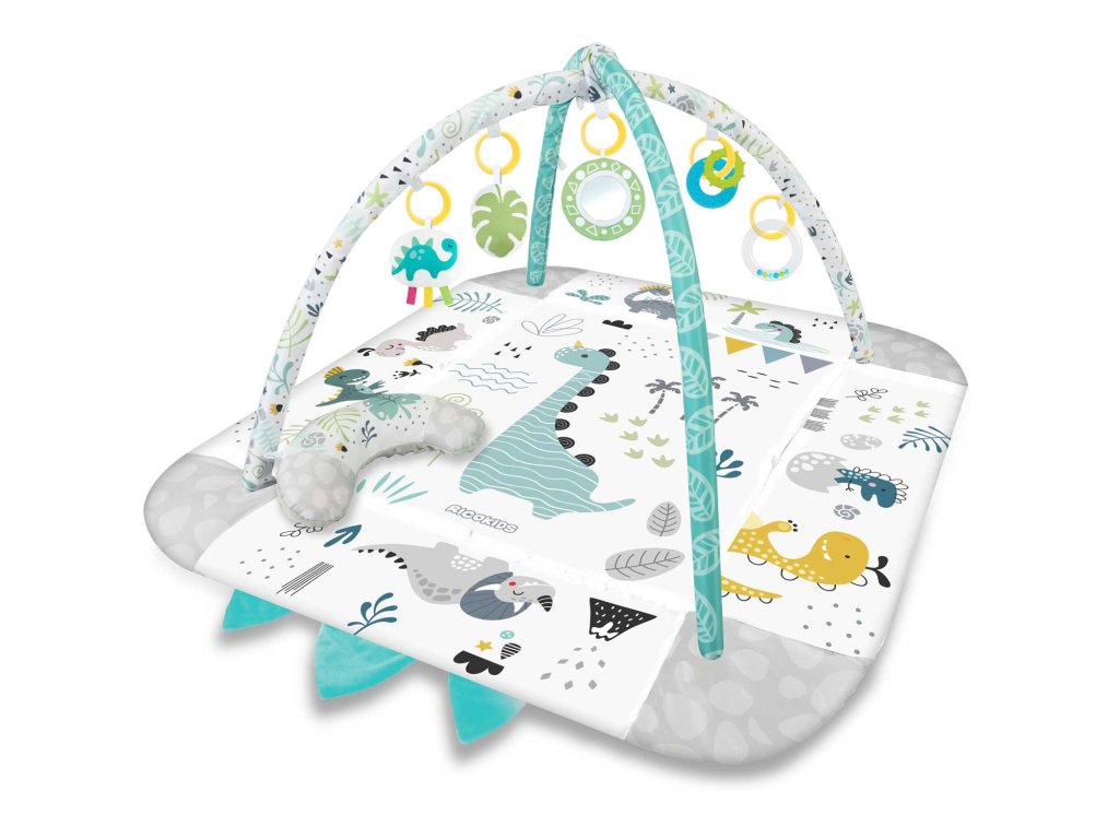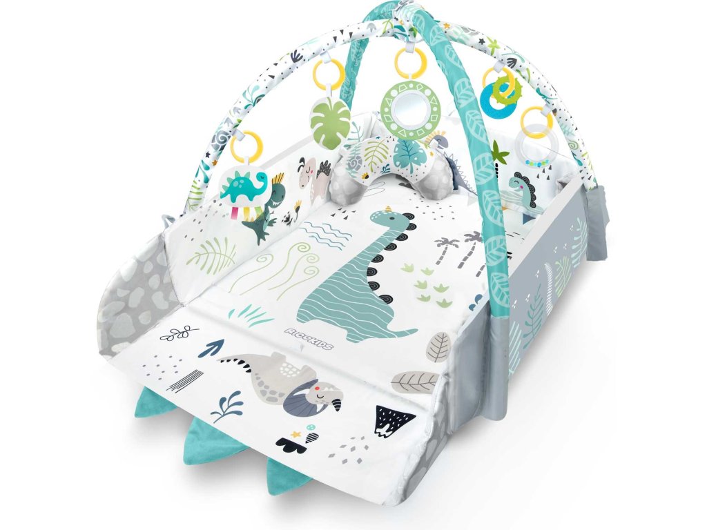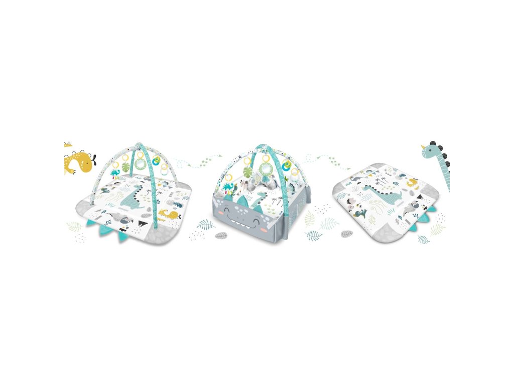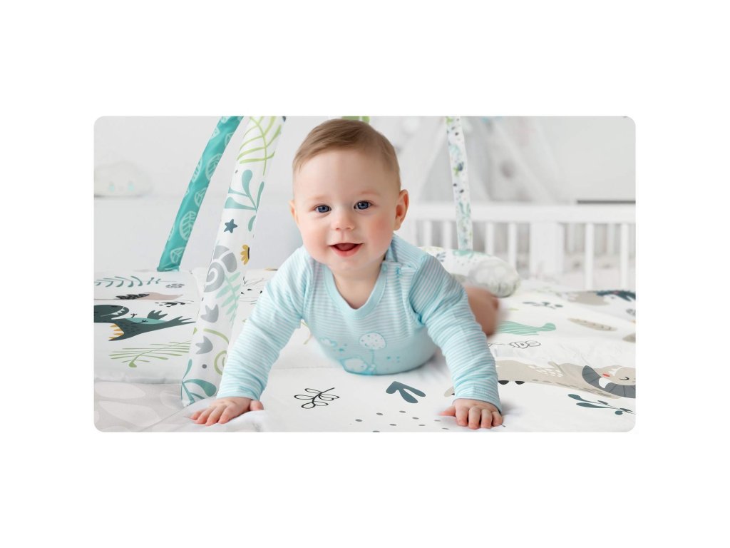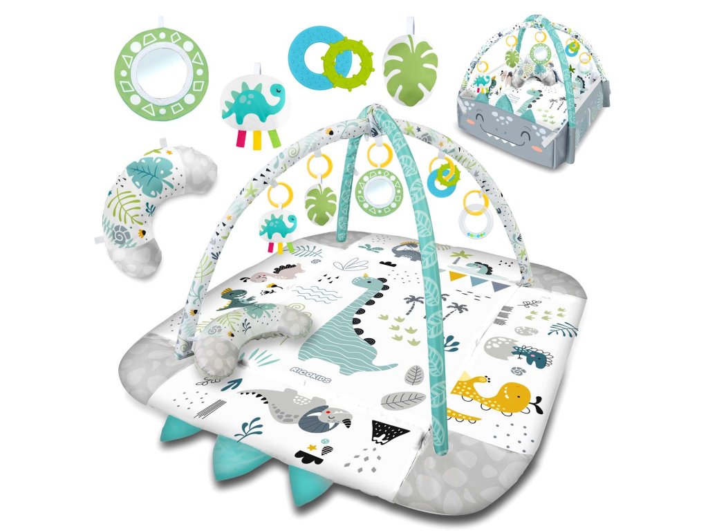 De aceea am inclus jucării multifuncționale care pot fi atârnate de arcadele covorașului - zdrăngănitul sau foșnetul atrag atenția și curiozitatea copilului. Este disponibilă și o jucărie care țipă și un dinozaur cu panglici care stimulează atingerea!