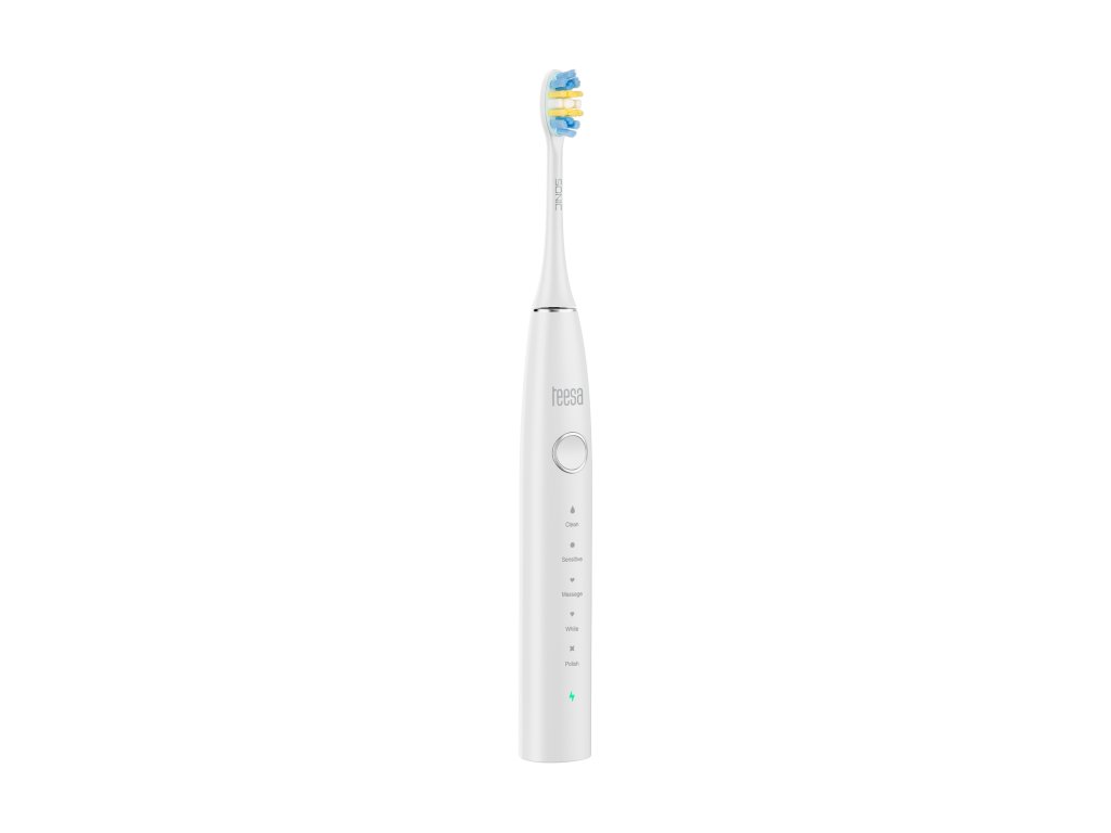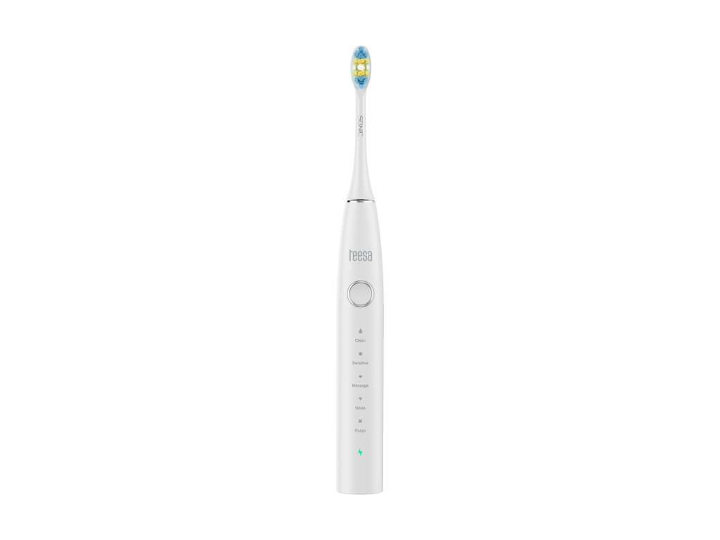 Periuța sonică de dinți Teesa Sonic 2 oferă 5 moduri: Clean (curățare zilnică), Sensitive (pentru gingii sensibile), Massage (masaj), White (albire), Polish (lustruire). Astfel, poți ajusta modul la nevoile tale, indiferent dacă ai dinți sensibili sau dorești să obții un efect de albire.
