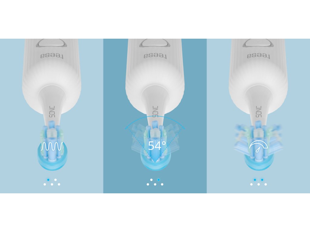 Periuța Teesa Sonic Elite permite reglarea ușoară a vibrațiilor, oscilațiilor și vitezei de lucru. Datorită celor trei moduri de curățare și posibilității de ajustare a intensității, puteți seta parametrii ideali conform nevoilor și sensibilității gingiilor.