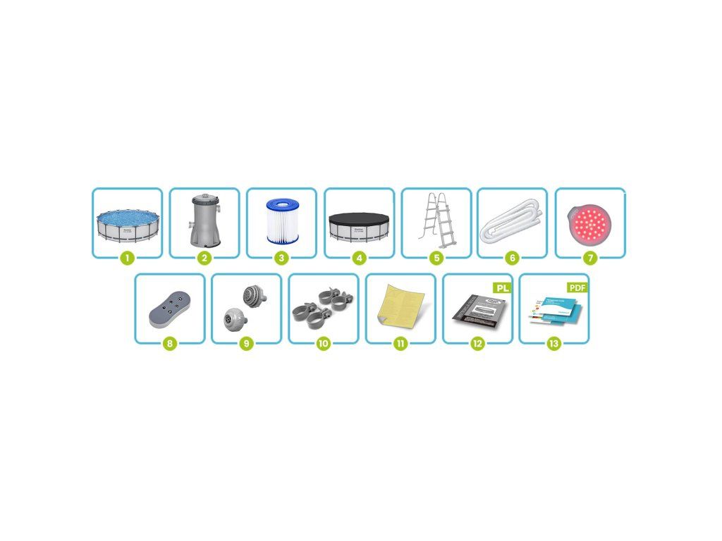Basen ogrodowy stelażowy Power Steel 457 x 107 cm ★★★★★ Nr katalogowy BESTWAY® 561GD HIT ★★★★★ ★ Jeśli potrzebujesz dużego, niezawodnego basenu, w którym będziesz mógł swobodnie pływać — to idealny wybór dla Ciebie! ★ Gotowy zestaw z kompletnym wyposażeniem – nie musisz sam szukać wszystkich elementów. ★ Kupując basen Bestway z dedykowanymi akcesoriami masz pewność, że otrzymasz najwyższą jakość i wszystko będzie do siebie pasować. ZAWARTOŚĆ ZESTAWU Basen stelażowy 457 x 107 cm Pompa filtrująca Filtr do pompy typ II Pokrywa basenowa Bezpieczna drabinka Węże do pompy Oświetlenie LED Pilot zdalnego sterowania Sitka do pompy Zaciski do pompy Łatka naprawcza Instrukcja w języku polskim Przewodnik do pobrania w aukcji Światła LED zmieniające kolory z pilotem Bezpieczeństwo dziecka Odłączane stopnie uniemożliwiają wejście dzieciom bez opieki Wysokość idealnie dobrana do wielkości basenu Wzmocniony metalowy stelaż odporny na korozje Antypoślizgowe stopnie Wygodne poręcze Najwyższa jakość wykonania Wytrzymały 3-warstwowy materiał PVC Wzmocnienie z nylonowej siatki pomiędzy warstwami Powłoka odporna na przebicia Wnętrze imitujące mozaikę w kolorze biało-niebieskim Basen gotowy w 3 szybkich krokach: Rozwiń powłokę. Złóż stelaż — bez użycia narzędzi. Nalej wodę — gotowe! Teraz rozłożenie tak dużego basenu zajmie Ci kilka chwil ✔️ Pompa filtrująca i ulepszony filtr do pompy w zestawie. DANE TECHNICZNE Basen Wymiary basenu 457 x 107 cm Waga 57.66 kg Zalecane wypełnienie wodą 90% Pojemność 14 970 litrów Pompa Wydajność pompy 3028 litrów/godz Zasilanie pompy 220 - 240 V Filtr do pompy typ II ❤️❤️❤️ Spraw by to lato było pełne cudownych wrażeń! ❤️❤️❤️Parametri suplimentari