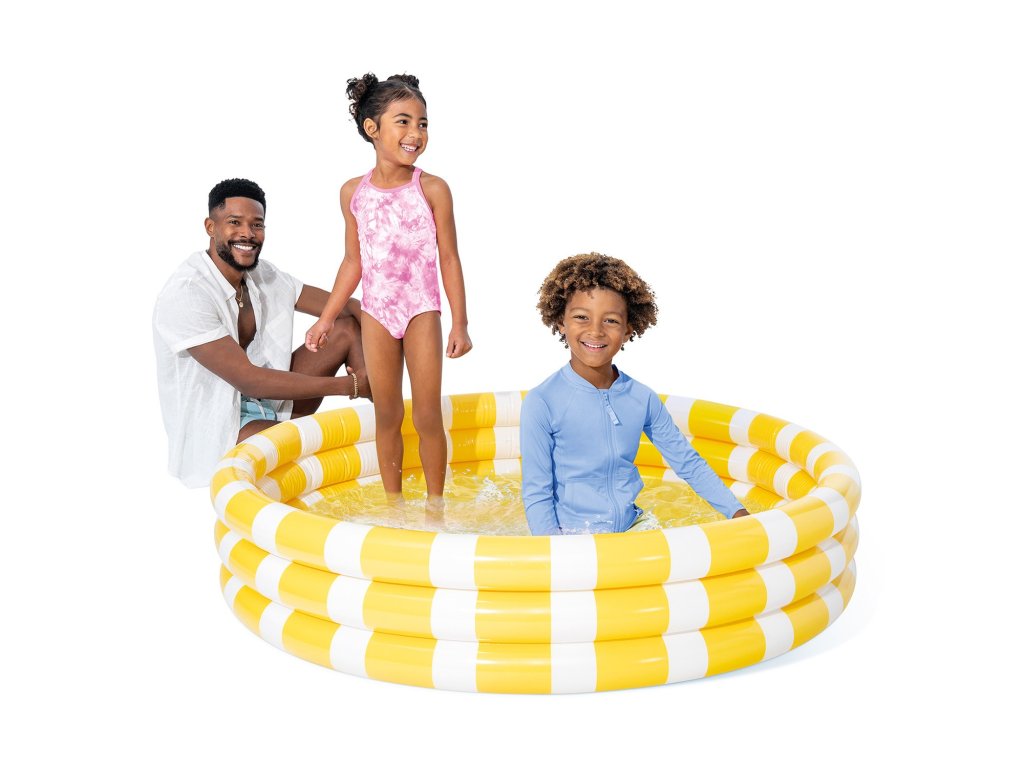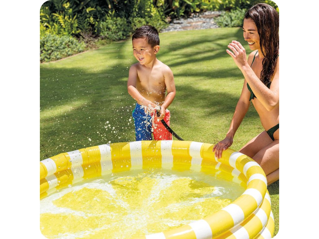 Piscina gonflabilă colorată Intex - este o piscină clasică gonflabilă fabricată din material de vinil robust, ale cărei pereți sunt creați din trei inele gonflabile proiectate să semene cu o lămâie.