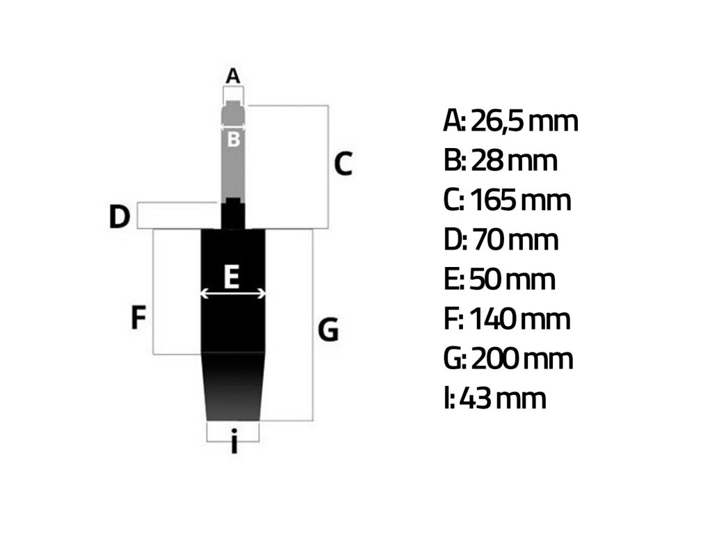 A: 26,5 / B: 28 / C: 165 / D: 70 / E: 50 / F: 140 / G: 200 / I: 43