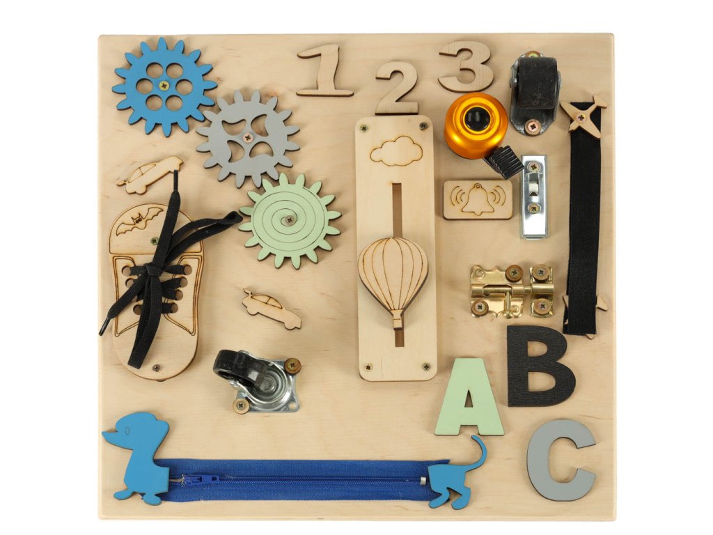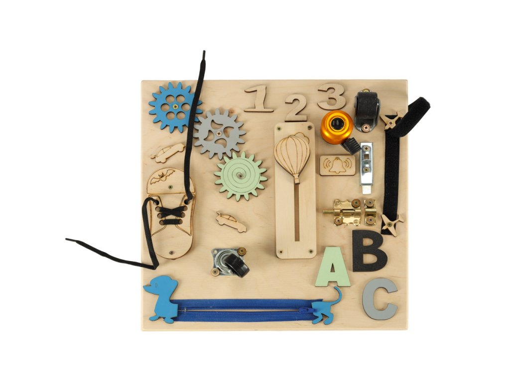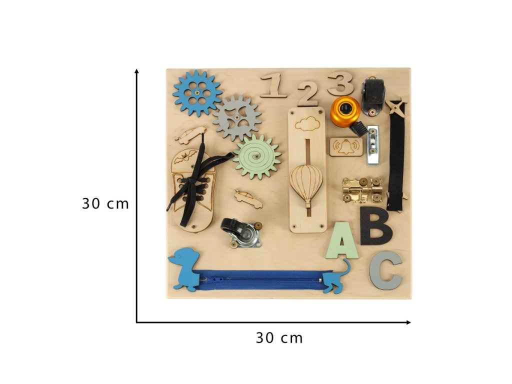 PLACĂ DE ACTIVITĂȚI SENZORIALE DIN LEMN 30X30CMO jucărie care oferă dezvoltare corespunzătoare și garantează super distracție Este posibil așa ceva Cu siguranță! Iar placa de activități este dovada!