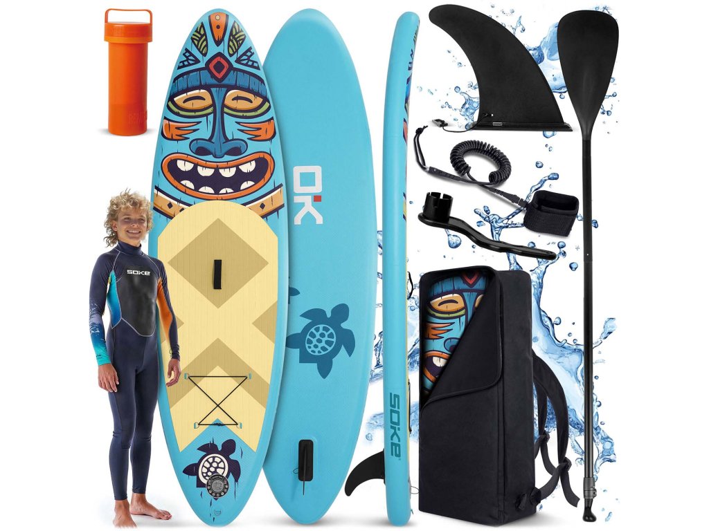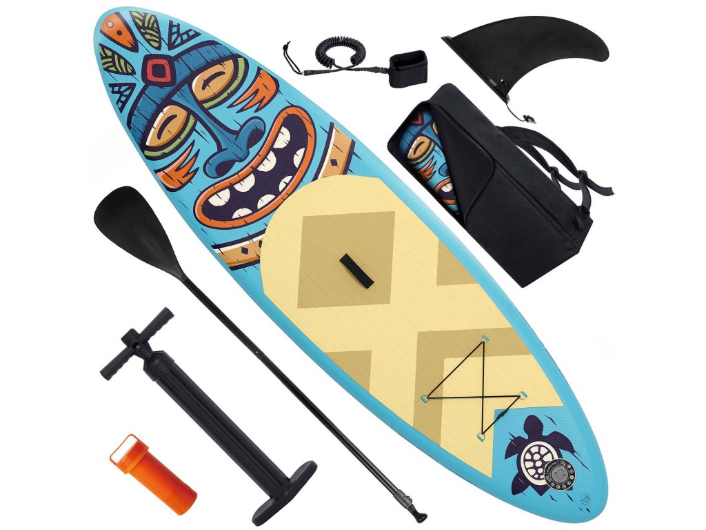 Setul include: placă, pompă, vâslă, lesă, aripioară mare detașabilă, rucsac, set de reparații.