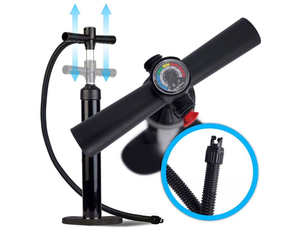 Pompare bidirecțională – pompează aerul atât la apăsare, cât și la ridicarea pistonului – vei umfla placa mai rapid.