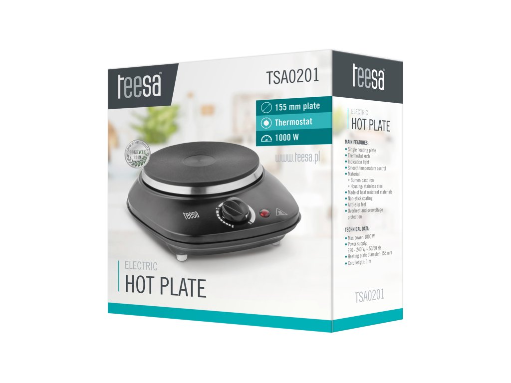 Vă interesați de o mică plită electrică portabilă pentru parcelă sau camping Alegeți modelul Teesa TSA0201 cu o putere de 1000 W și un arzător din fontă. Cu o temperatură maximă de până la 530 °C, fierbe rapid apa pentru ceai și cafea și pregătește micul dejun sau cina pentru întreaga familie. Controlul convenabil al plitei portabile Teesa este asigurat de un buton al termostatului cu indicator luminos. Calitatea înaltă a plitei turistice portabile Teesa este evidențiată de materialele rezistente la căldură folosite. TSA0201 este realizată din oțel inoxidabil cu suprafață antiaderentă, care facilitează considerabil curățarea. Funcționarea stabilă și sigură este garantată de picioarele antiderapante și funcția de protecție la supraîncălzire și supratensiune.