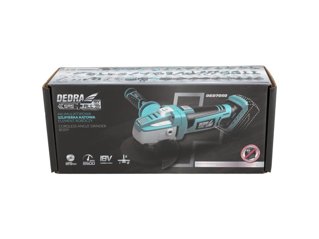 Acest instrument este destinat tăierii și slefuirii. Motorul de șlefuire ajunge la viteza de 9.500 rotații pe minut și este compatibil cu discuri de 125 mm și 115 mm. Polizorul este echipat cu un întrerupător de siguranță care oprește alimentarea dacă presiunea asupra piesei de prelucrat este prea mare, ceea ce ar putea duce la deteriorarea sau supraîncălzirea mașinii. Datorită sistemului de prindere rapidă a lamei, mânerului lateral în trei poziții și mânerului cauciucat, unealta este mult mai confortabil de utilizat. Cheia pentru schimbarea lamei este plasată în mânerul lateral, astfel încât o aveți întotdeauna la îndemână, atunci când este necesar să schimbați lama sau bitul de uneltă. Carcasa este realizată din nylon armat cu fibre de sticlă, ceea ce crește rezistența la deteriorări mecanice și radiații UV. Ergonomia și confortul sunt sporite de greutatea redusă a dispozitivului și mânerul cauciucat. Bateria recomandată pentru utilizarea cu polizorul unghiular cu acumulator este DED7034 cu o capacitate de 4,0 Ah. Caracteristici ale polizorului unghiular cu acumulator DEDRA SAS+ALL DED7050: