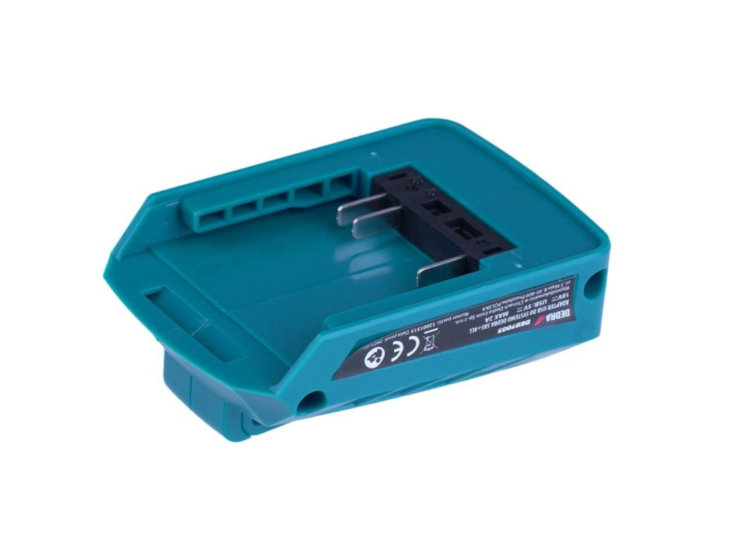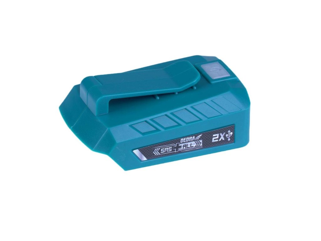 Cu acest adaptor, bateria pentru uneltele electrice DEDRA SAS+ALL (adaptator compatibil cu DED7032, DED7034, DED7035, DED6936, DED6937) poate fi transformată într-o powerbank pentru încărcarea dispozitivelor electronice, cum ar fi smartphone-uri, difuzoare bluetooth etc. Două prize USB permit încărcarea a două dispozitive digitale simultan. Clema permite atașarea adaptorului la curea, astfel încât să îl aveți mereu la îndemână. Comutatorul de pe partea superioară a adaptorului este întotdeauna ușor accesibil.