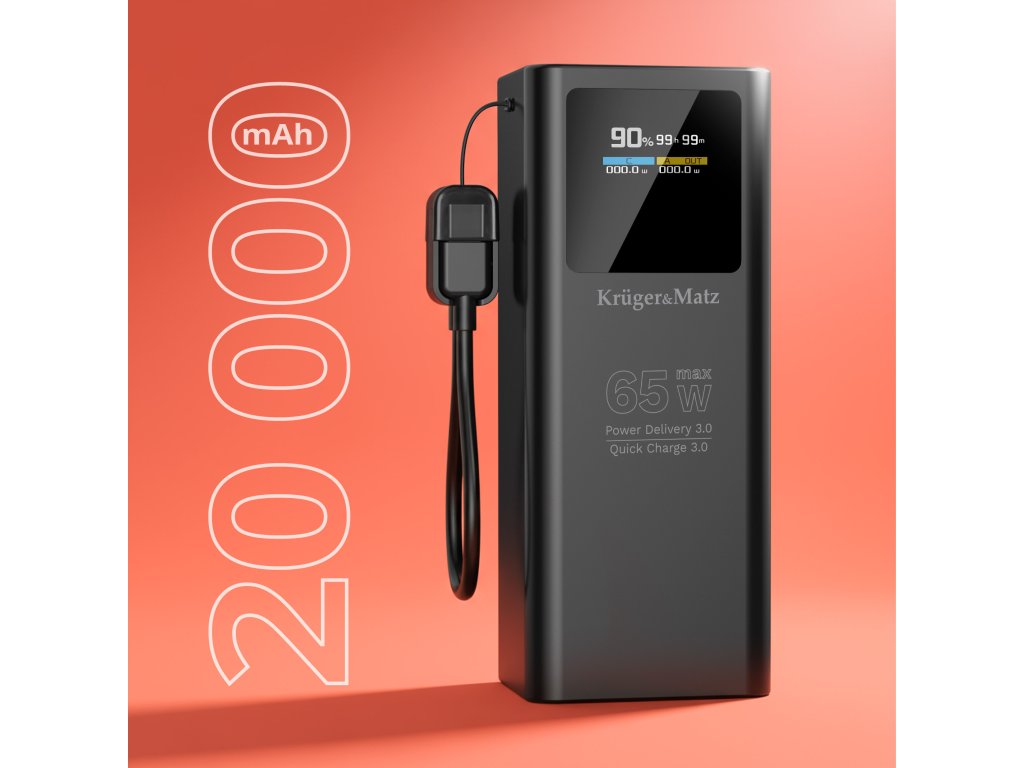 PowerBank Kruger&Matz 20000 mAh Li-ion 65W cu funcție QC și PD