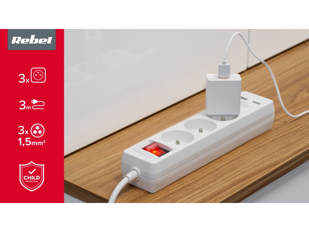 Număr de prize: 3 (tip francez) + 2x USB (2,1 A)Lungime: 3 m (3G 1,5 mm)