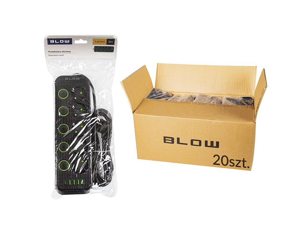 Prelungitor de rețea BLOW de culoare neagră, cu cinci prize, destinat utilizării la domiciliu. Prelungitorul permite conectarea dispozitivelor care sunt departe de priză. Produsul are pe o parte 5 prize rotite sub un unghi și un întrerupător, iar pe cealaltă un singur conector de rețea unghiular.