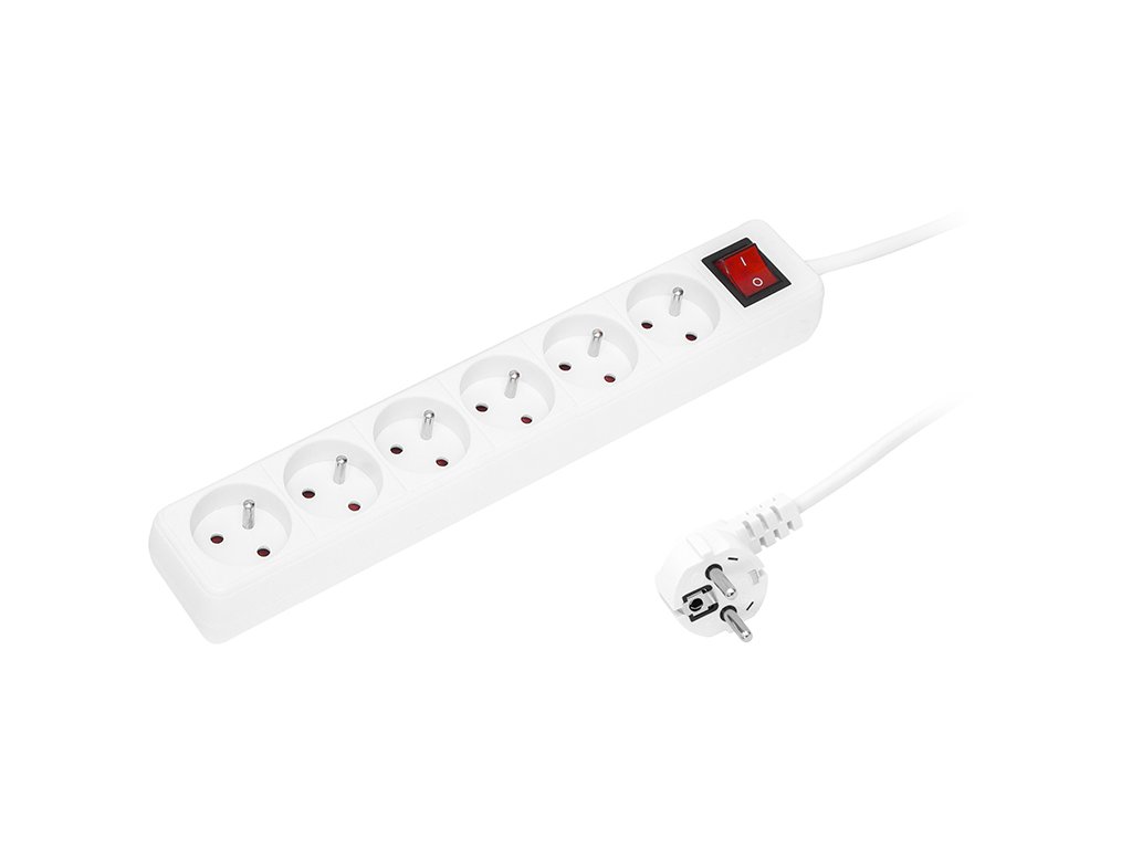 Prelungitor de rețea PR-670WSP cu conector de rețea unghiular, 6 prize împământate și comutator.