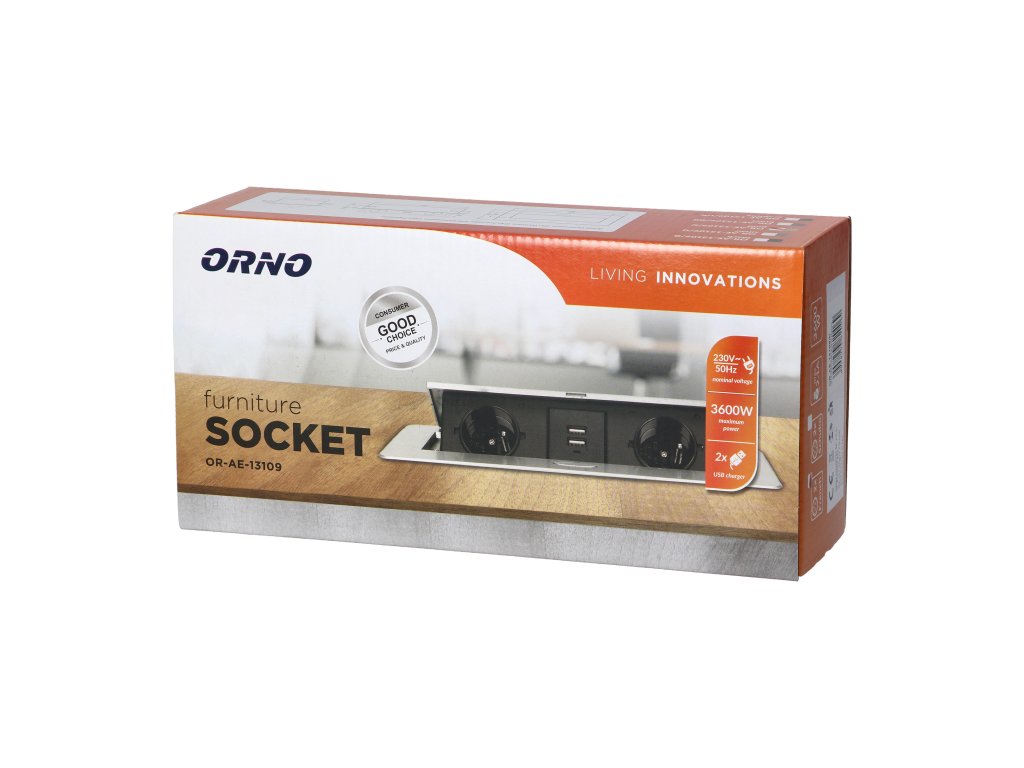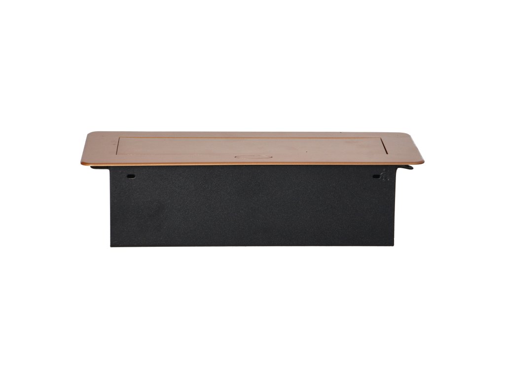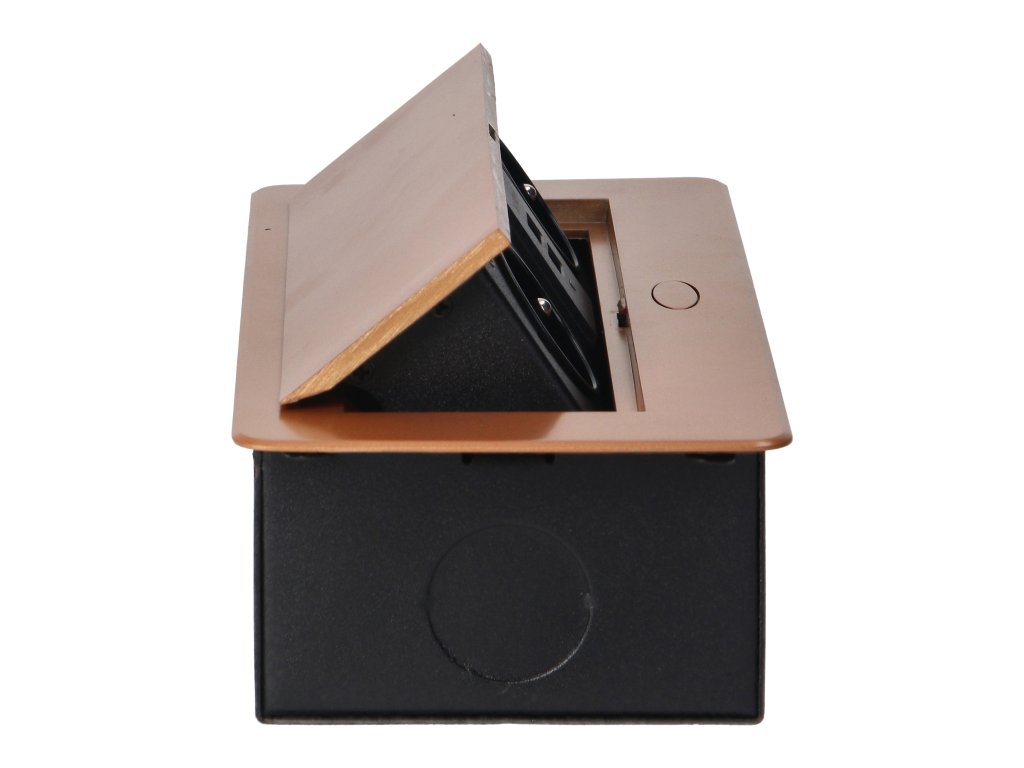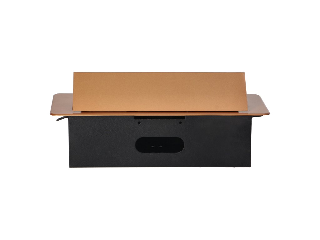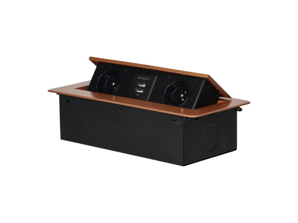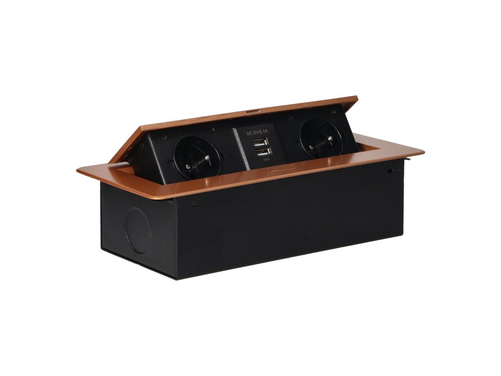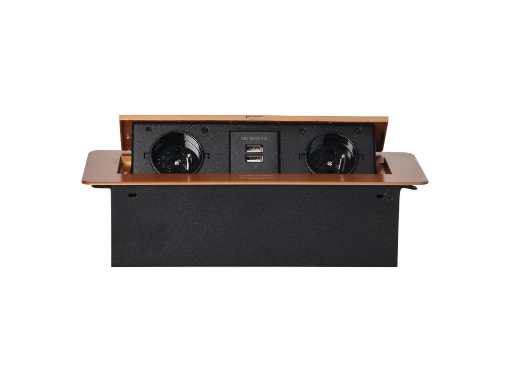Set de două prize de rețea cu împământare și protecție la curent în combinație cu două încărcătoare USB. Setul este încorporat într-o carcasă care poate fi integrată în mese, blaturi de lucru și birouri. Poate fi montat atât vertical, cât și orizontal, asigurând astfel acces facil la prizele electrice. Datorită muchiei plate (doar 2 mm), capacul cu prize se potrivește perfect în suprafața de exemplu a mesei și nu incomodează la curățarea acesteia. Cablu recomandat OWY 3 × 1,5 mm² (nu este inclus în pachet). Culoare - auriu.Informații generale: