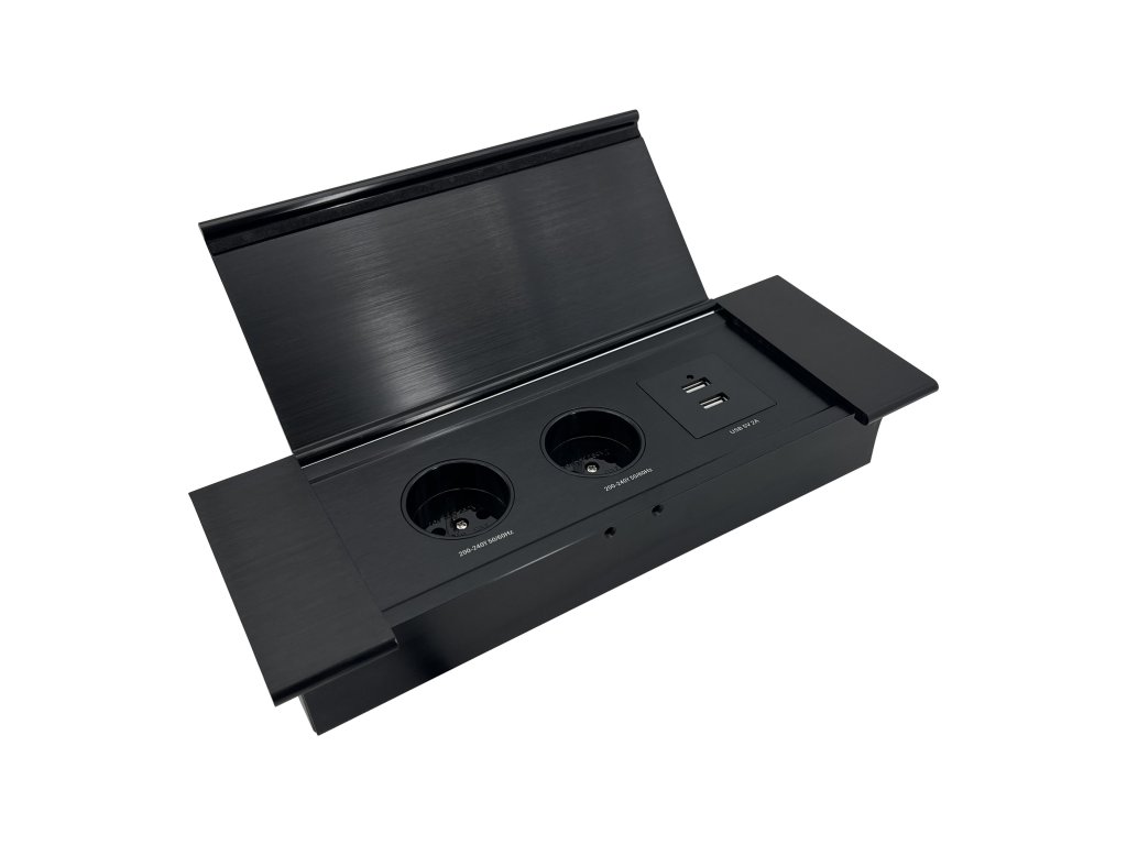 Priză de mobilier încastrată cu margine fresată plată, capac rabatabil, încărcător USB și cablu de 1,5 m, 2x2P+E (Schuko), 2xUSB (tip A+C; 3,6A), negru