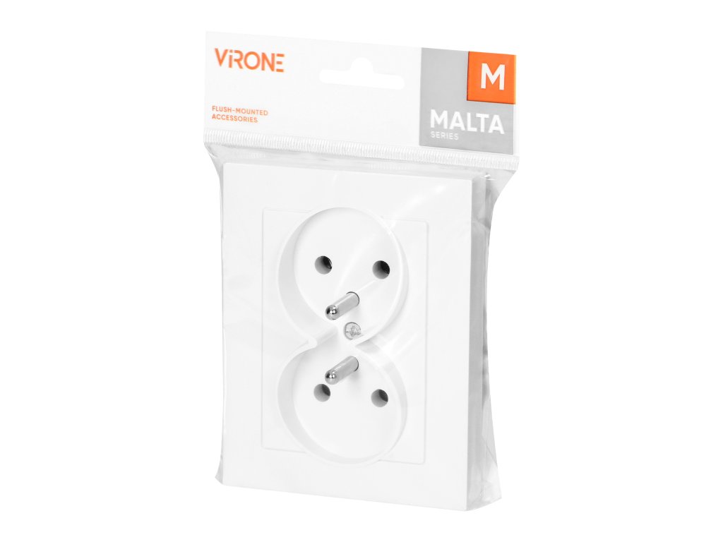 Malta este seria simplă de întrerupătoare și prize încastrate. Mecanismul modern de conectare rapidă al întrerupătoarelor (firele sunt conectate prin împingerea directă în corp) asigură instalarea și îndepărtarea sigură a firelor. Prizele sunt echipate cu conexiuni tradiționale cu șurub. Designul intern al bornelor garantează o conexiune sigură a firelor de la 0,75 mm² la 2,5 mm². Grila de montare robustă și puternică și elementele speciale de montare permit instalarea stabilă și sigură în cutie.Priză dublă tip francez 2x2P+E. Proiectată pentru montare încastrată. Ar trebui utilizată în interior (IP20).