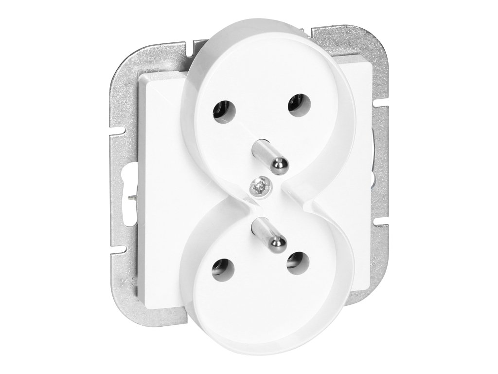 Seria modulară cu un sistem de plăci de cadru simetrice (pentru 1-, 2-, 3-, 4-, 5-module) permite montarea produsului atât în poziții orizontale, cât și verticale. Mecanismul modern de conectare rapidă (firele sunt conectate prin împingerea lor direct în corp) asigură o instalare și îndepărtare sigură a firelor. Prizele sunt echipate cu conexiuni tradiționale cu șuruburi. Designul intern al terminalelor garantează o conexiune sigură a firelor de la 0,75 mm² la 2,5 mm². Grila de montare robustă și elementele de autoretragere de înaltă calitate permit o instalare stabilă și sigură în cutie. Elementele speciale de resort facilitează potrivirea cadrului în corp.Priză dublă de tip francez, 2x2P+E. Proiectată pentru montare încastrată într-un sistem de plăci de cadru. Ar trebui să fie folosită în interior (IP20).