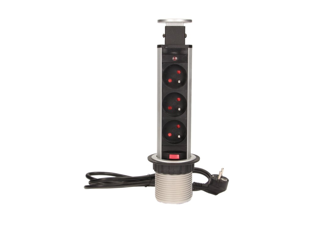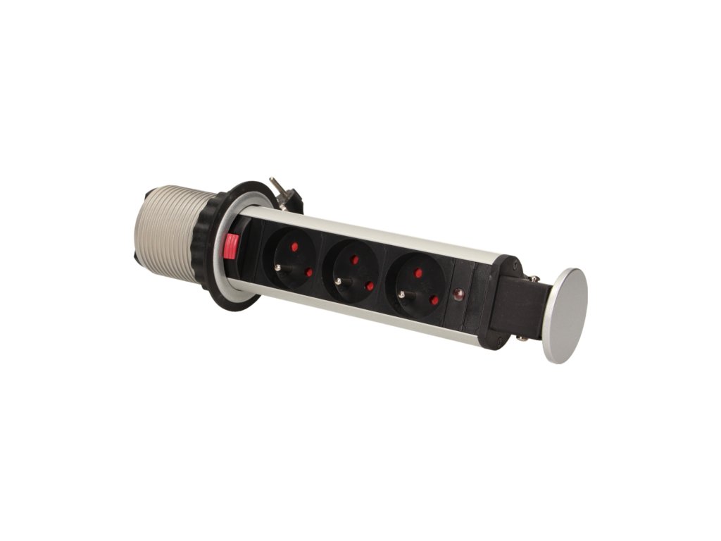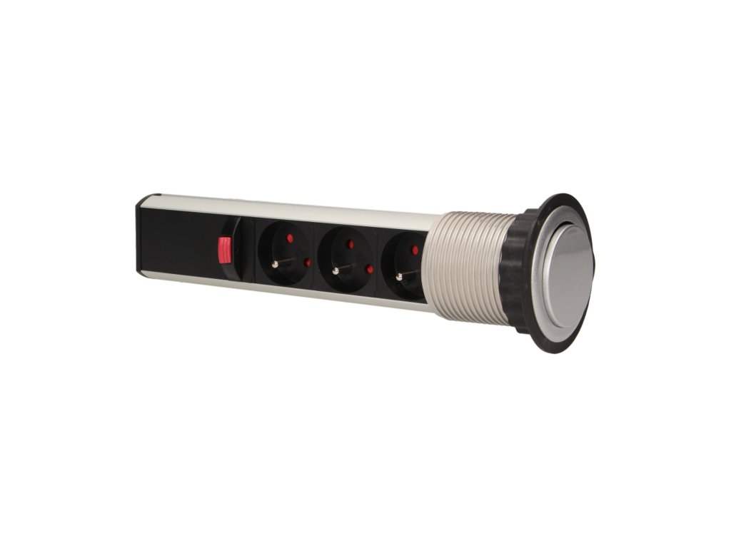 Set de trei prize electrice 2P+Z într-un capac superior glisant oferă acces la prizele electrice. Are un panou glisant cu prize și o blocare suplimentară. Destinat pentru instalare interioară în mese, blaturi și mobilă de birou. Pentru instalarea dispozitivului în blat de masă este necesară doar o singură gaură cu un diametru de 6 cm.Specificații tehnice