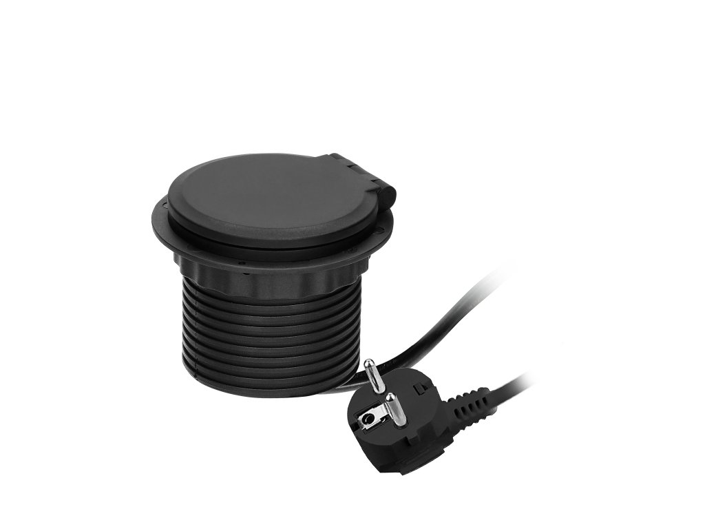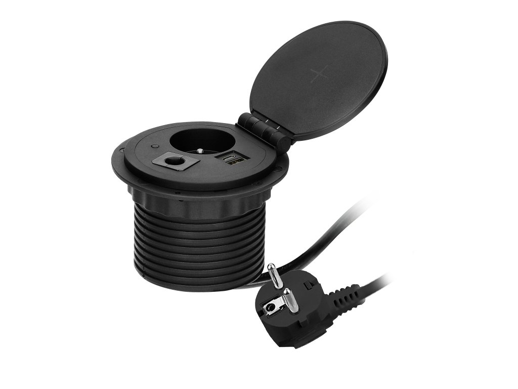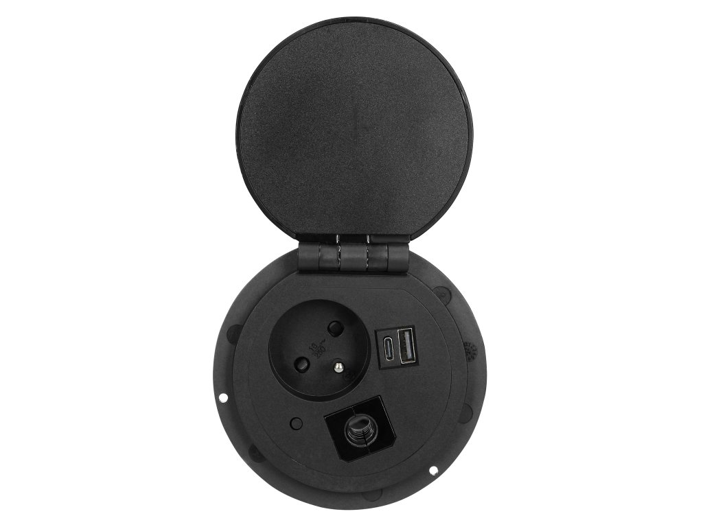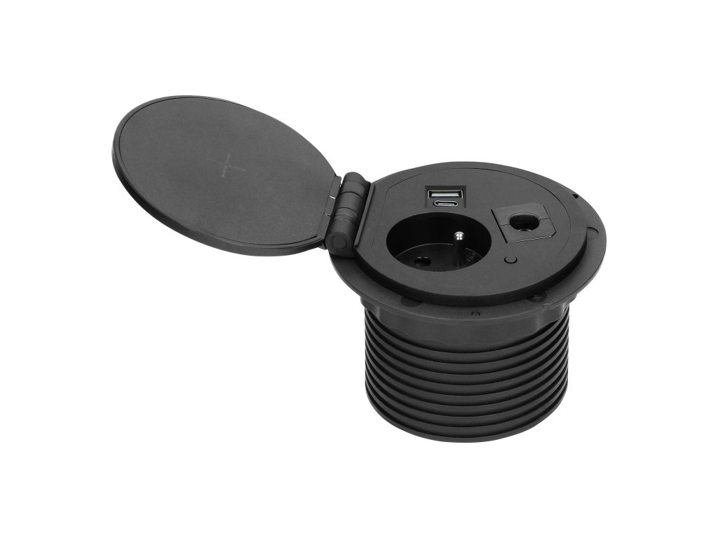 Această priză încastrată poate fi integrată în suprafața oricărui birou. Conține 1 priză electrică 1x2P+E, un încărcător cu inducție, 2 porturi (A, C) pentru încărcare rapidă USB și un modul suplimentar interschimbabil, care poate fi înlocuit cu orice alt modul funcțional (alte accesorii), permițând conectarea electrocasnicelor de diferite tipuri într-un singur loc. Dispozitivul are un cablu de 1,8 m lungime. Culoare: negru.Specificații tehnice: