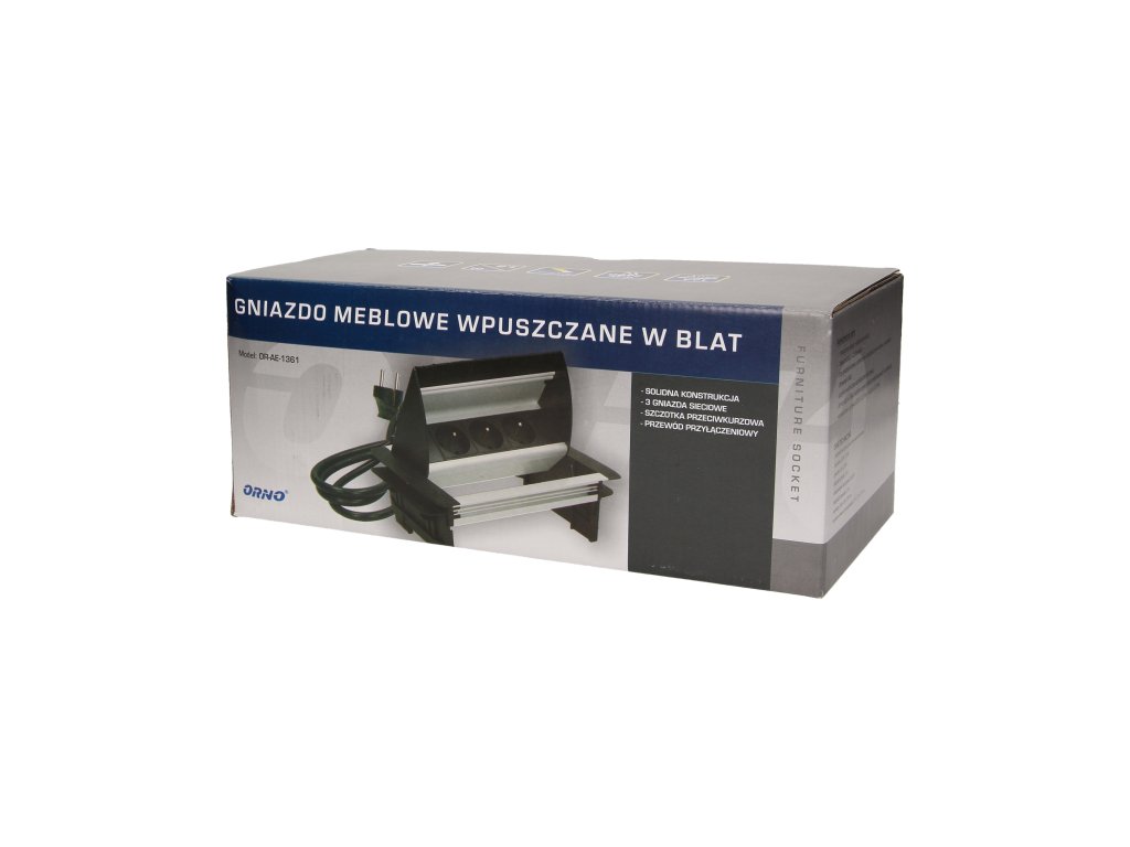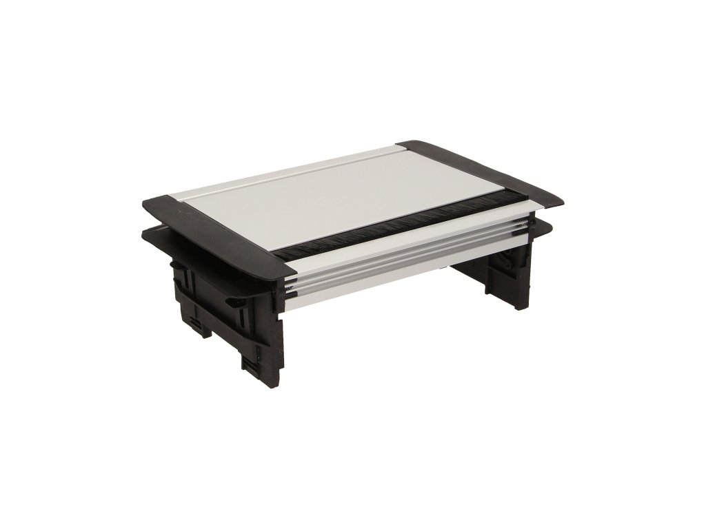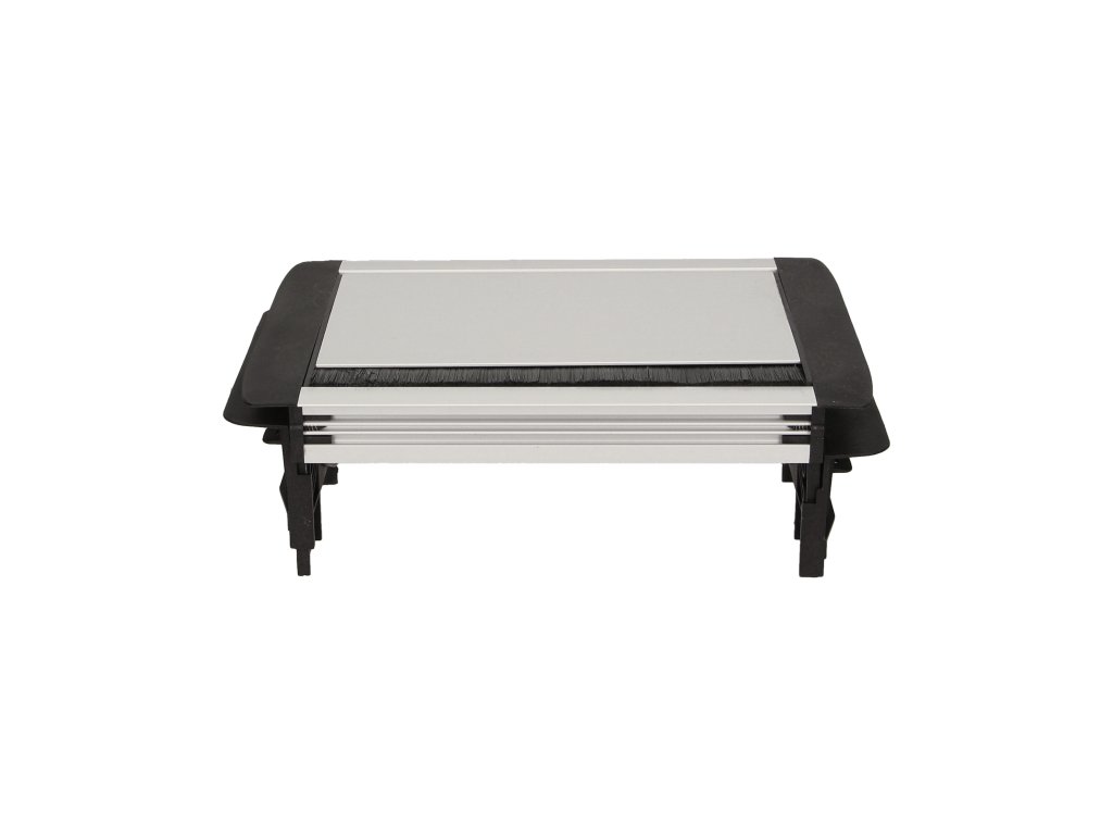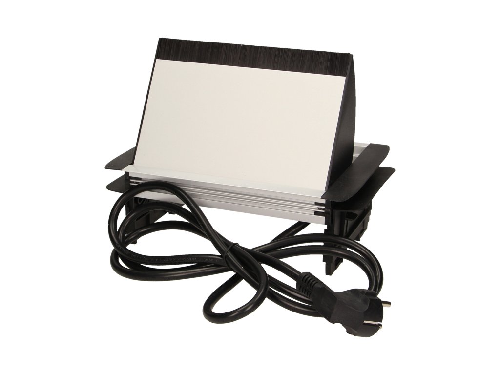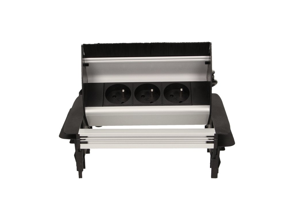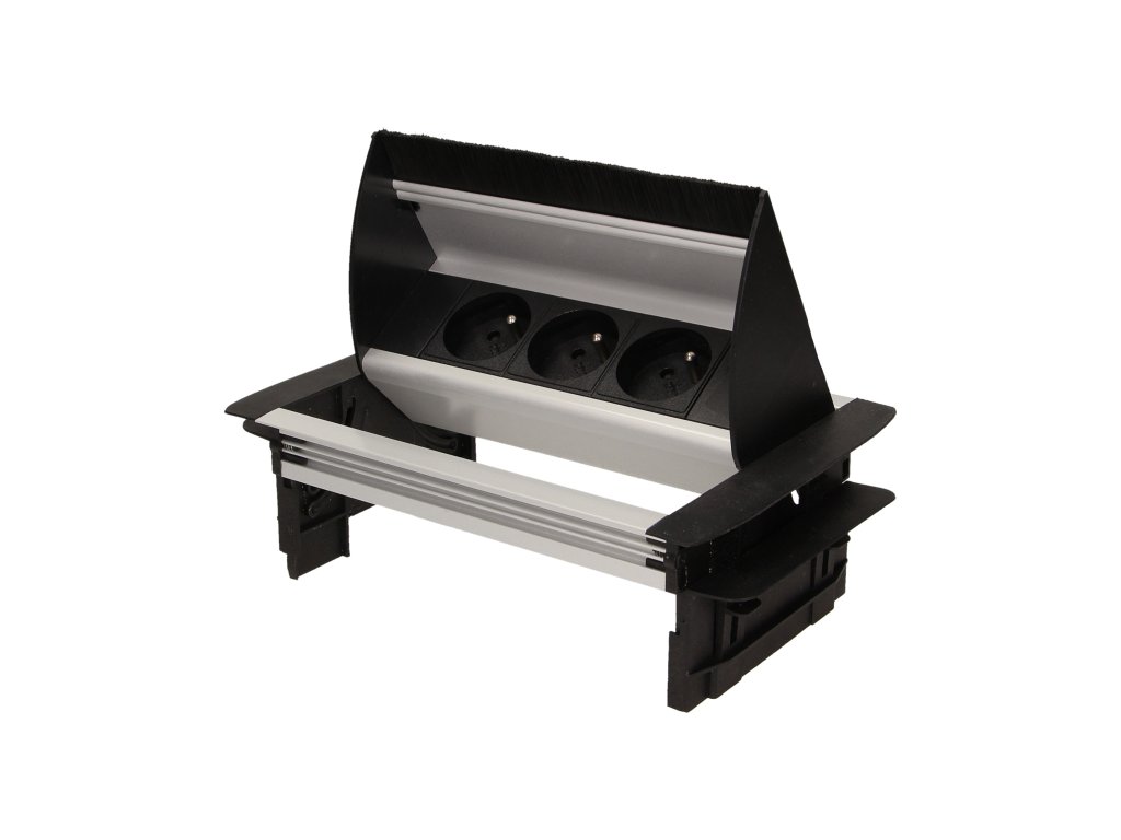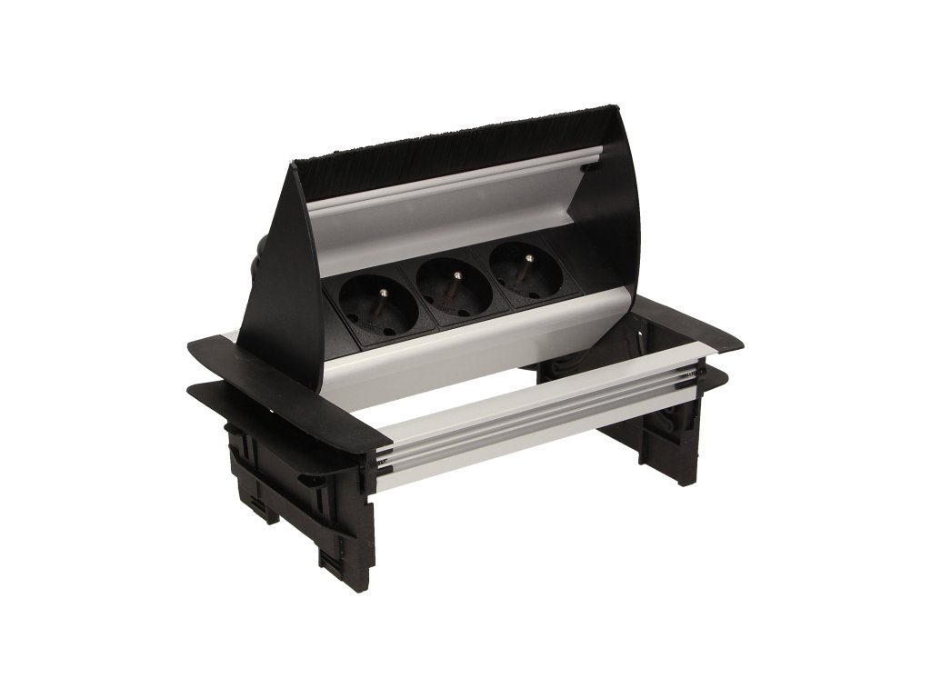 Set de trei prize electrice 2P+Z cu perie antipraf în capacul superior culisant. Proiectat pentru instalare în interior, pe mese, blaturi și birouri, atât vertical cât și orizontal, oferind acces la prize electrice.