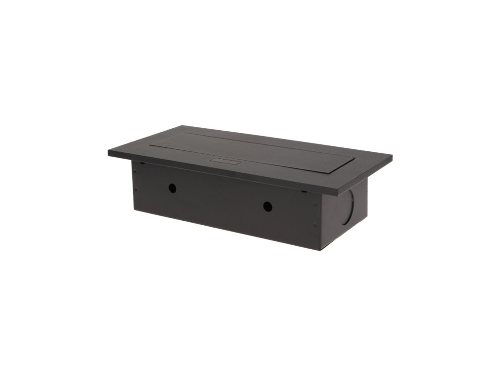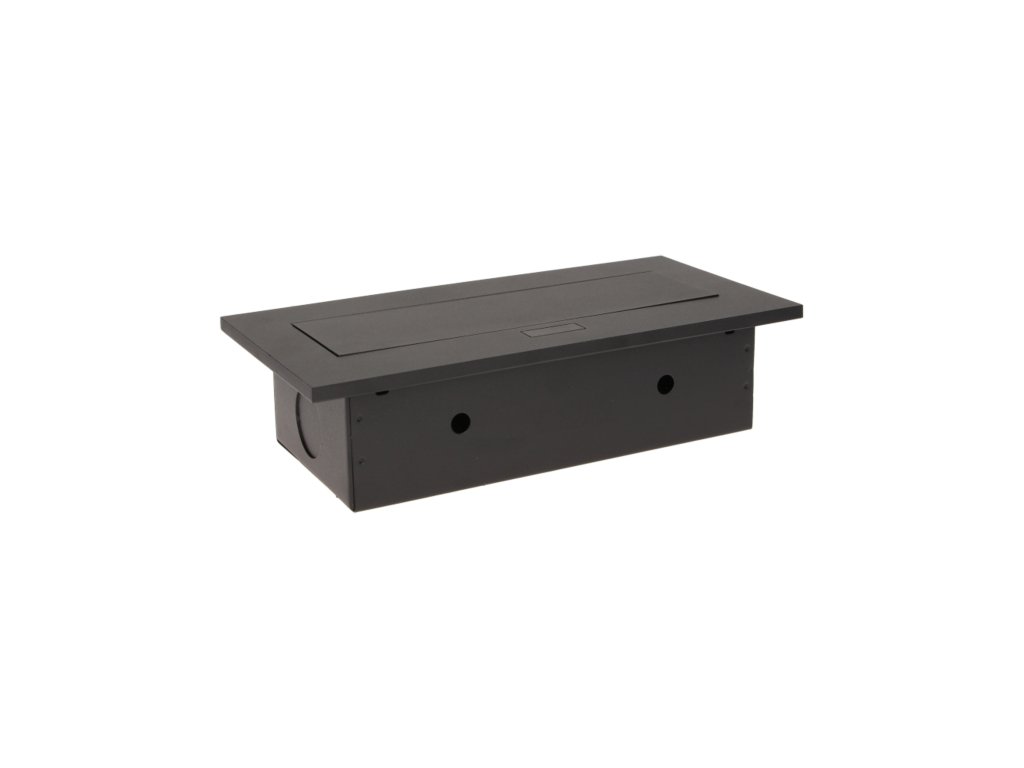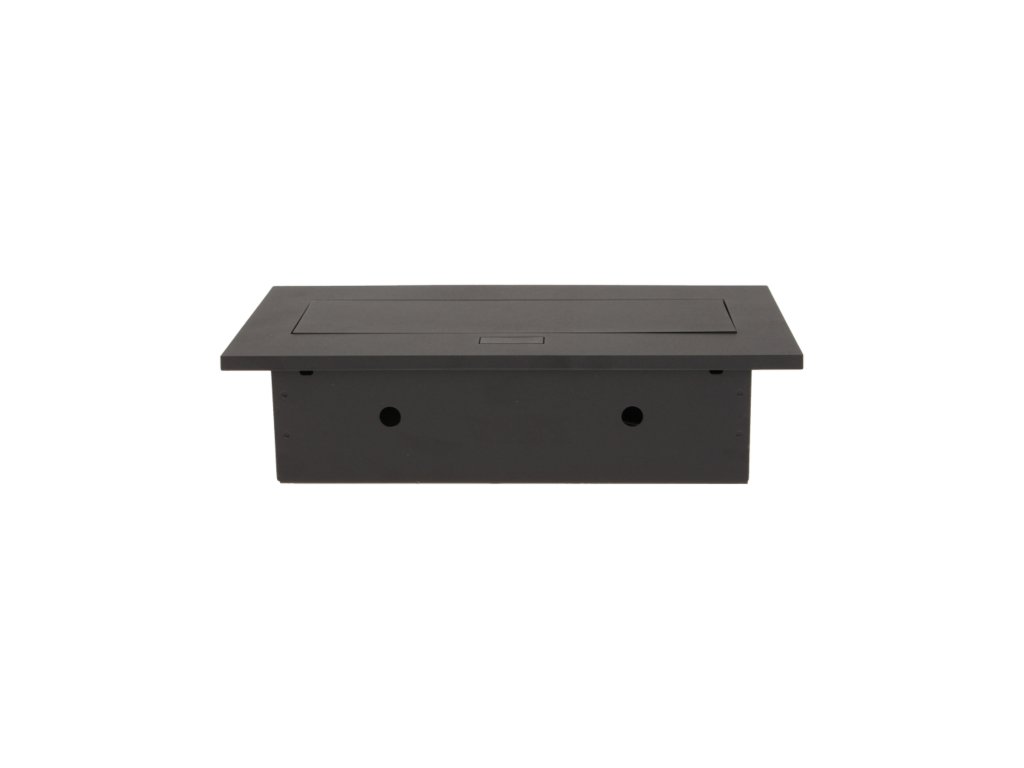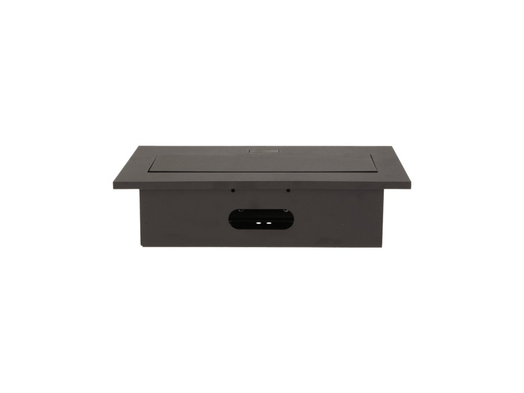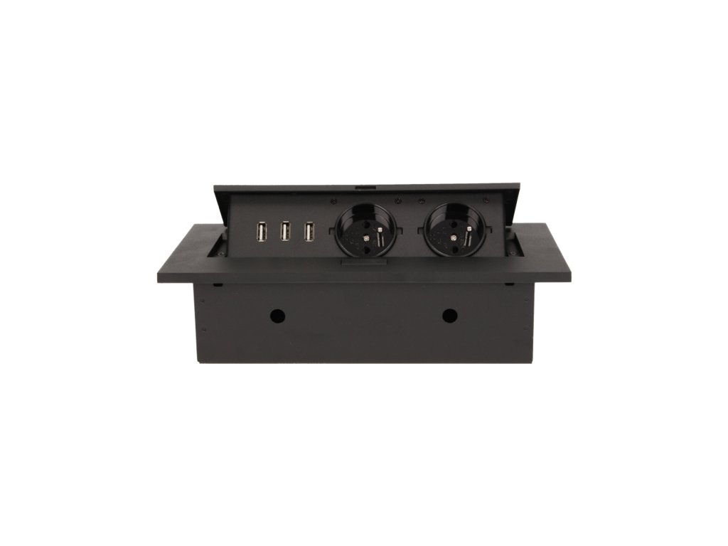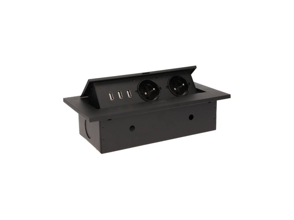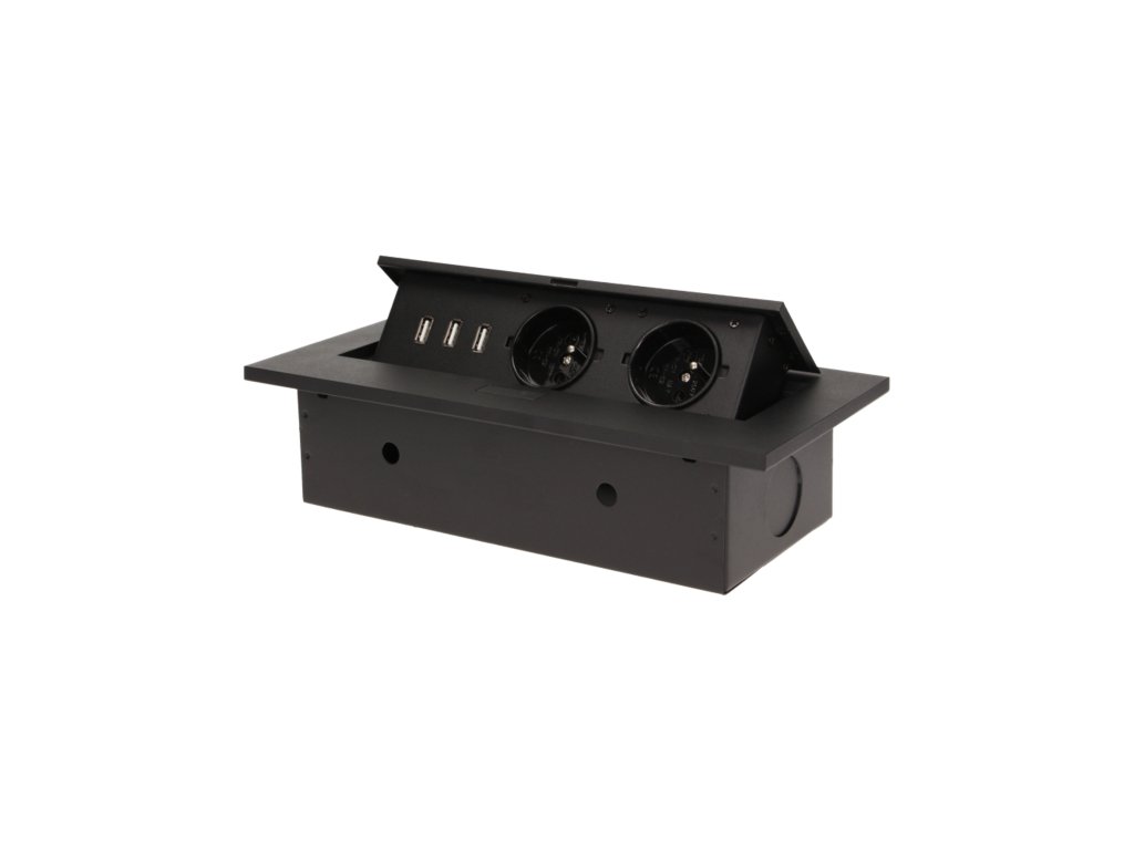Set de două prize 2P+Z cu trei porturi USB (fără alimentare) în capacul superior glisant. Destinat pentru instalare interioară în mese, blaturi și măsuțe atât în poziție verticală, cât și orizontală, oferind acces la prizele electrice.Specificație tehnică