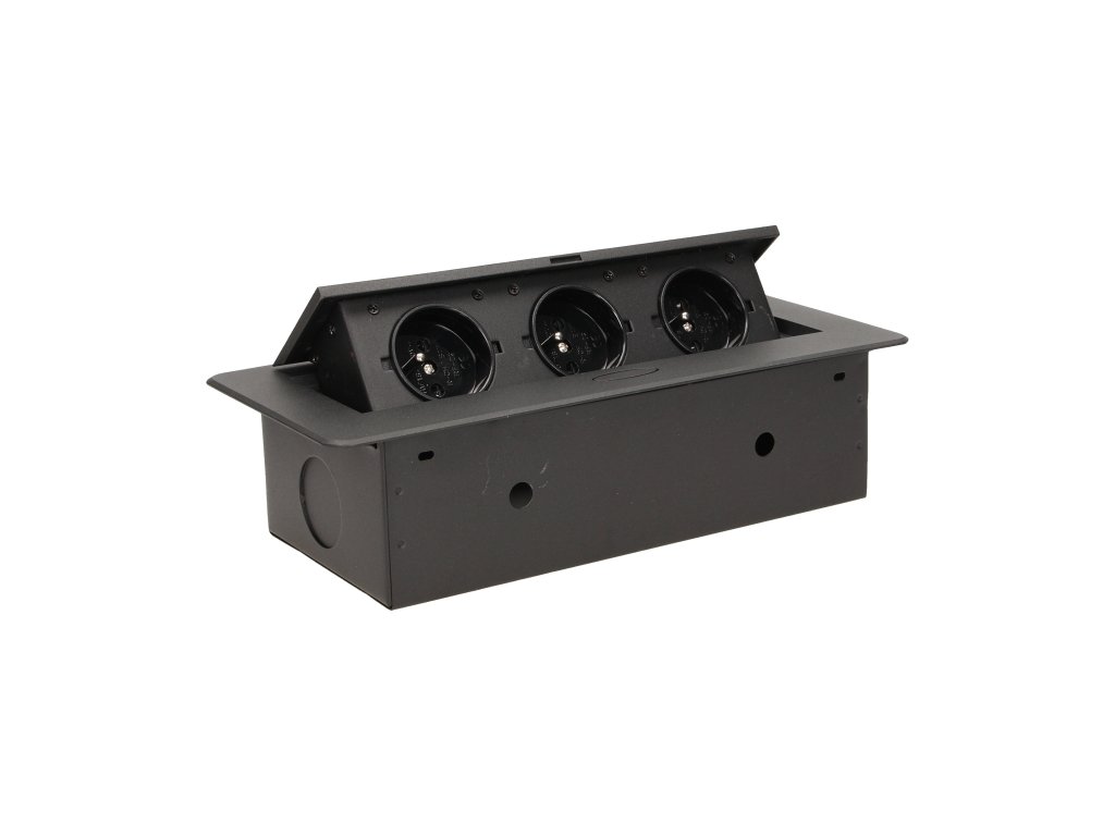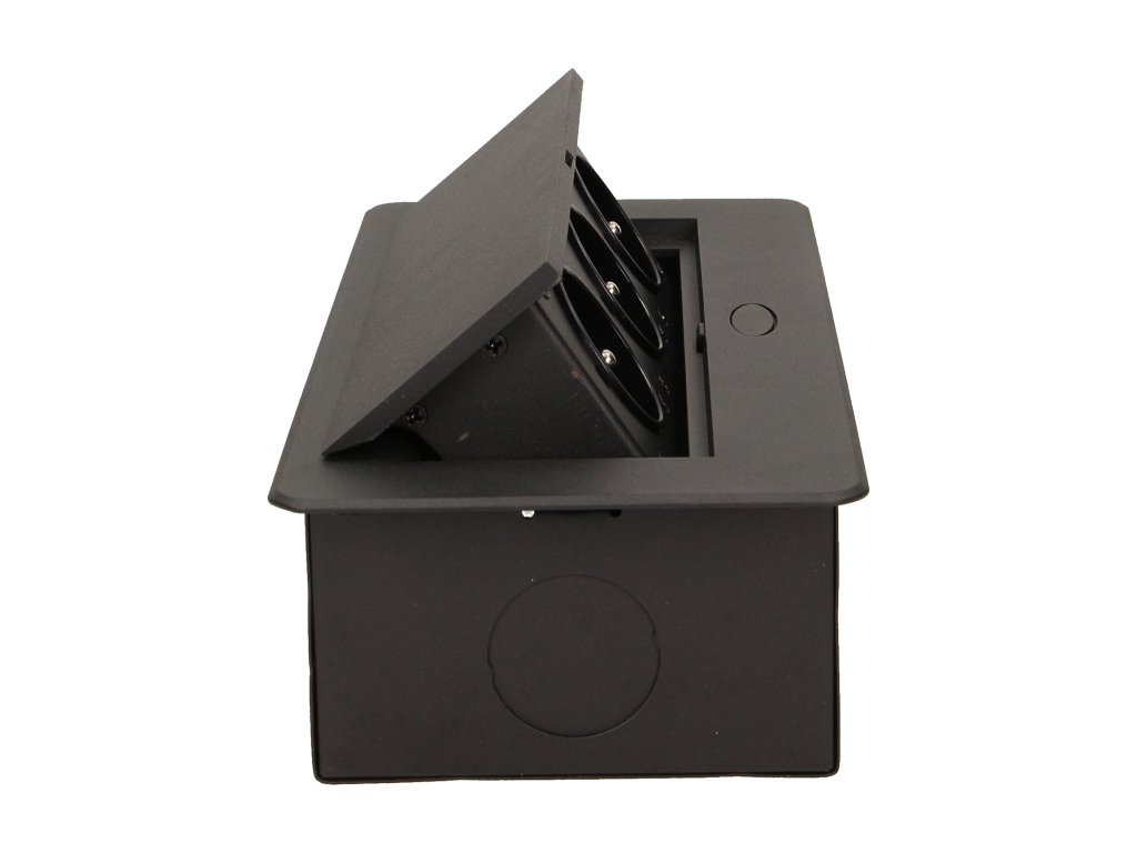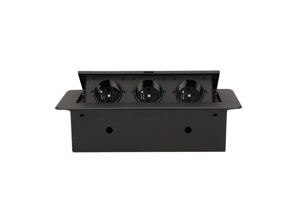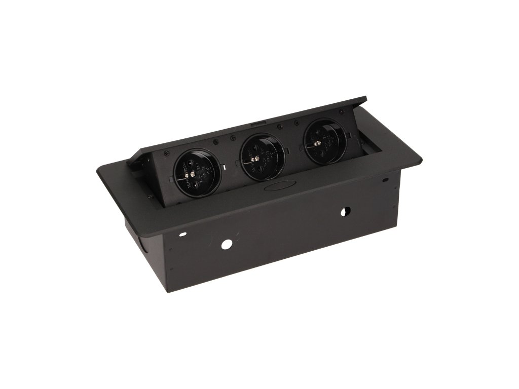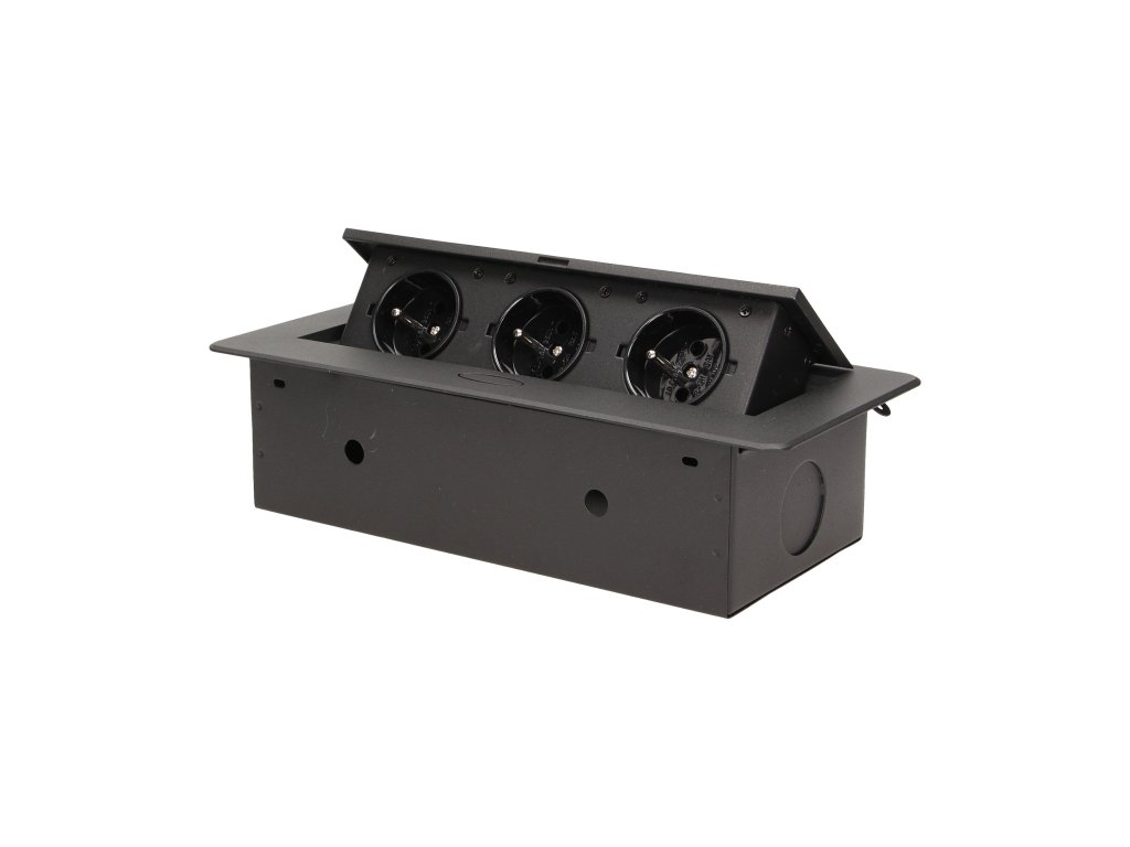 Set de trei prize electrice 2P+Z în capacul superior retractabil. Destinat pentru instalare interioară în mese, blaturi de masă și măsuțe, în poziție verticală și orizontală, oferind acces la prizele electrice.Specificații tehnice