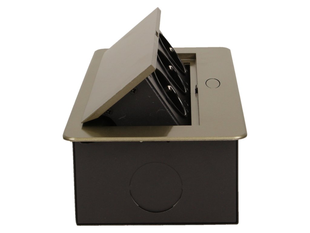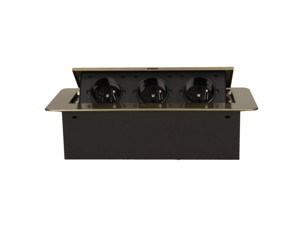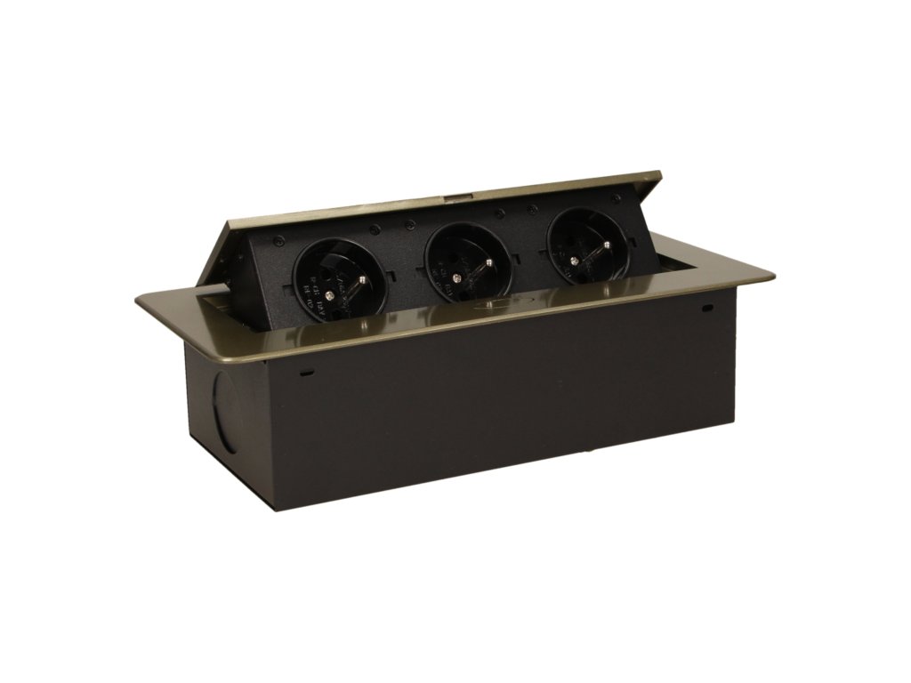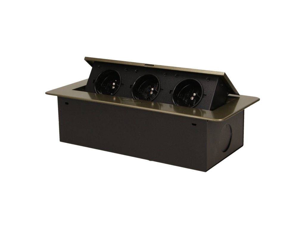 Set de trei prize electrice 2P+Z în capacul superior glisant. Destinate pentru instalare interioară în mese, blaturi și mese în poziție verticală sau orizontală, oferind acces la prizele electrice.Informații generale: