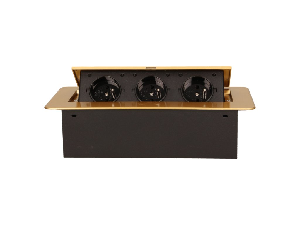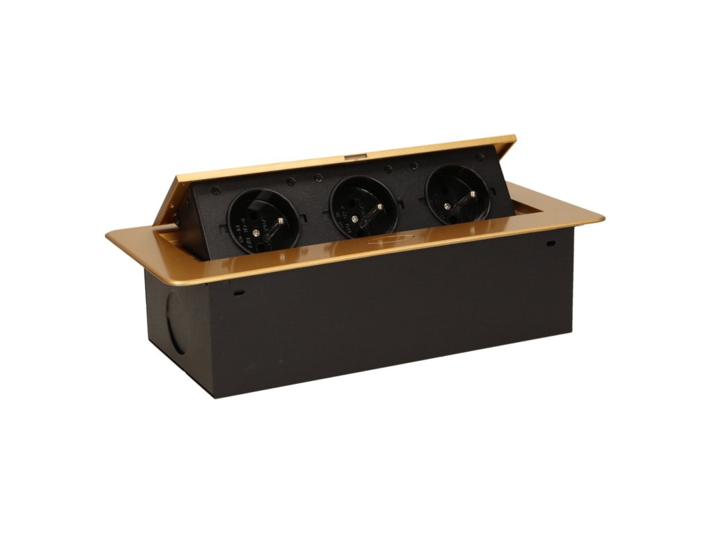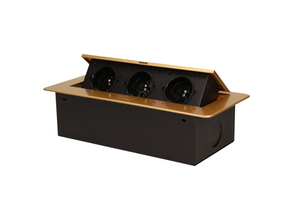 Set de trei prize electrice 2P+Z în capac superior retractabil. Destinate instalării interne în mese, blaturi și măsuțe în poziție verticală și orizontală, oferind acces la prizele electrice.Specificații tehnice