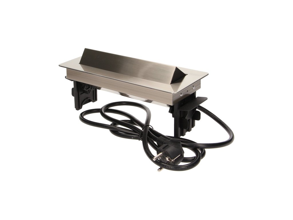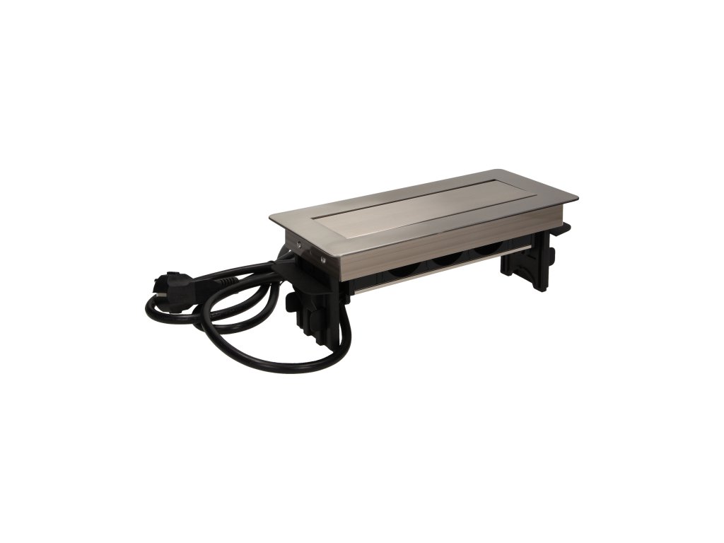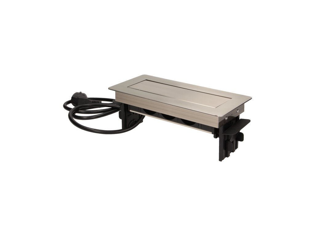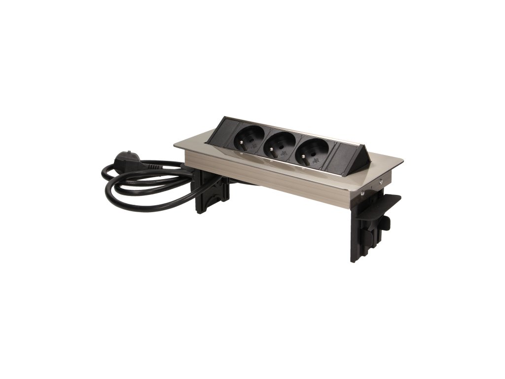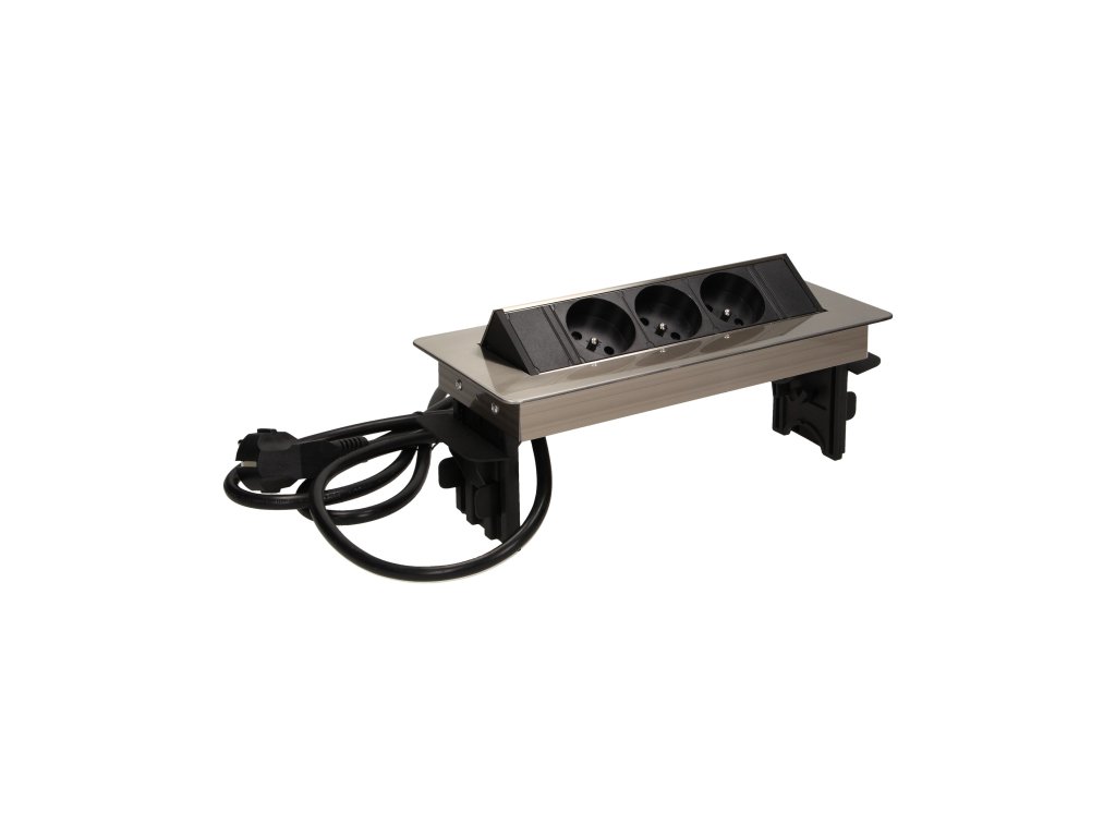 Set de trei prize de alimentare 2P+Z într-o carcasă nichelată, cu parte superioară retractabilă. Dispozitivul este destinat instalării în birouri, plăci și mese.