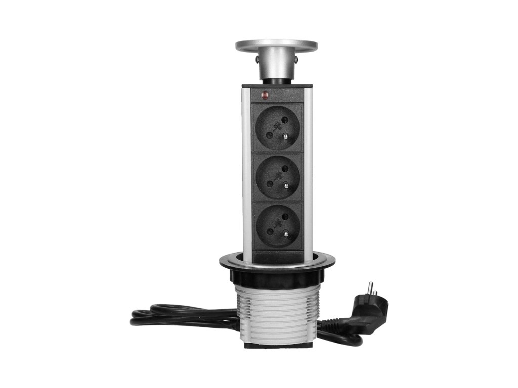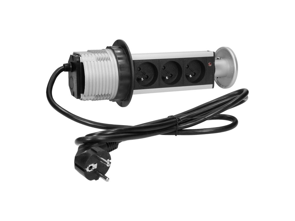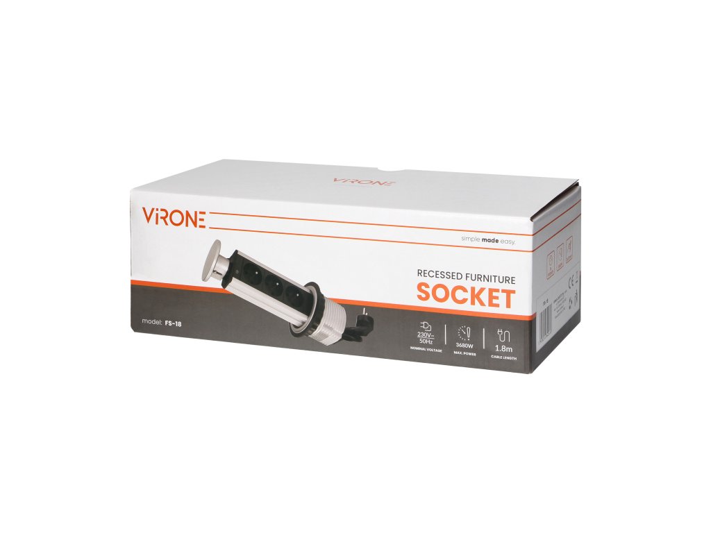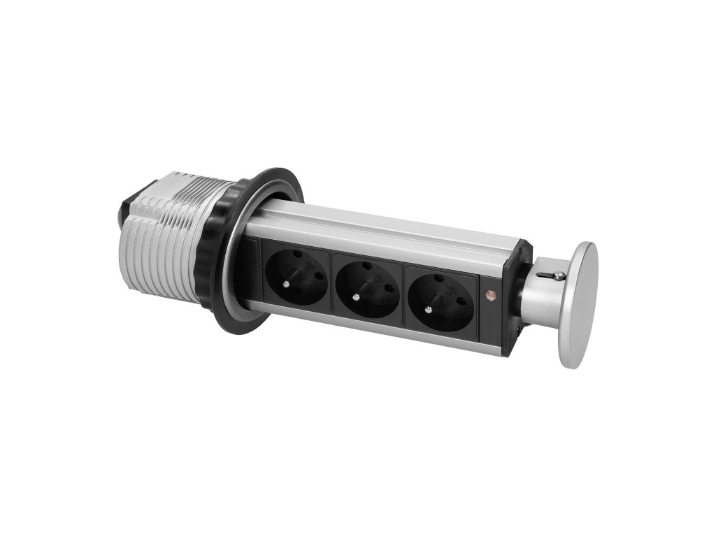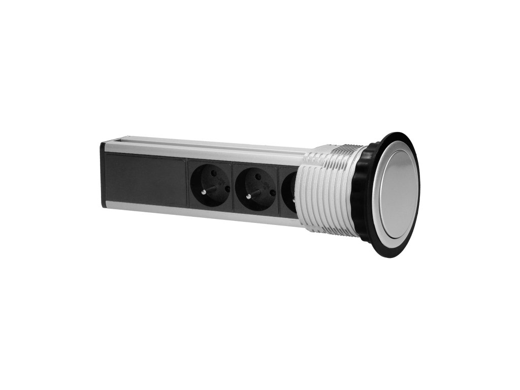 Prizezi discretă și funcțională triplă de mobilier VIRONE ne permite conectarea simultană a 3 dispozitive de 230V, cu o putere totală de până la 3680W.Instalarea ergonomică într-o singură gaură cu un diametru de 80 mm în blatul mesei, birou sau panou de mobilier asigură un aspect economic și elegant al spațiului. Sistemul de ejectare cu un singur clic economisește mult spațiu și timp, care în mod normal ar fi petrecut cu unirea cablurilor, conectarea și deconectarea distribuitoarelor și alte operațiuni pentru a menține ordinea cablurilor.