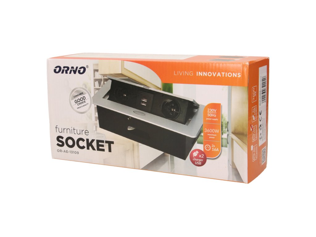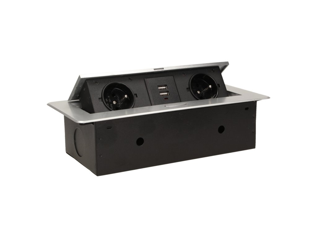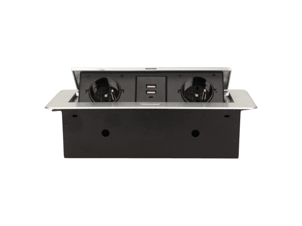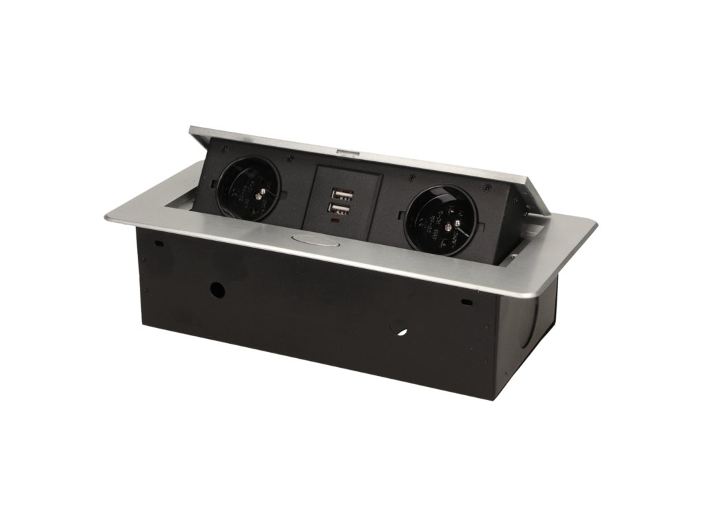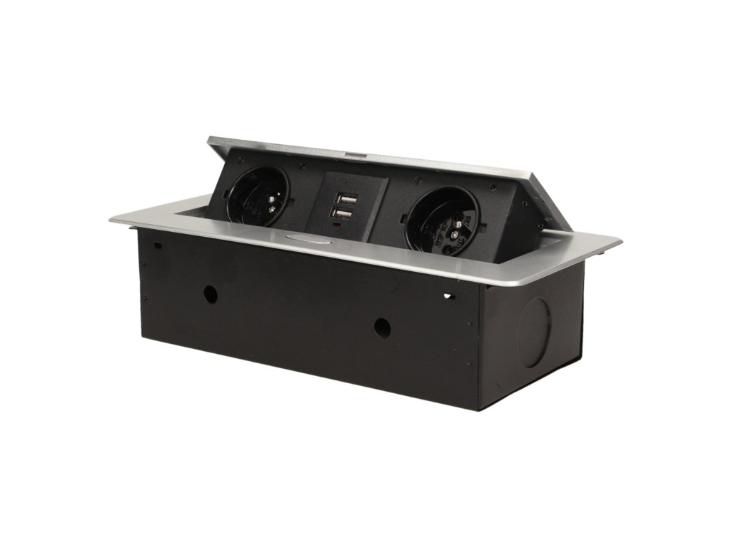 Set de două prize electrice cu încărcător USB încorporat în capacul superior rabatabil. Destinate pentru instalare în interiorul meselor, blaturilor și măsuțelor în poziție verticală și orizontală, oferind acces la prizele electrice.Specificații tehnice
