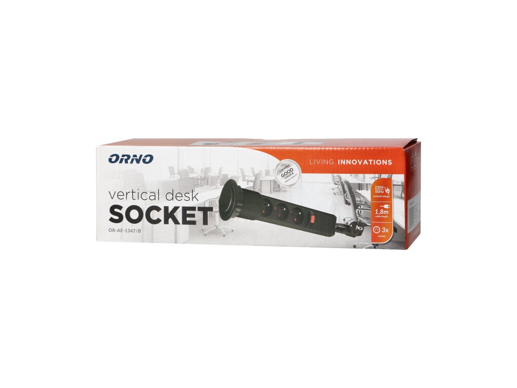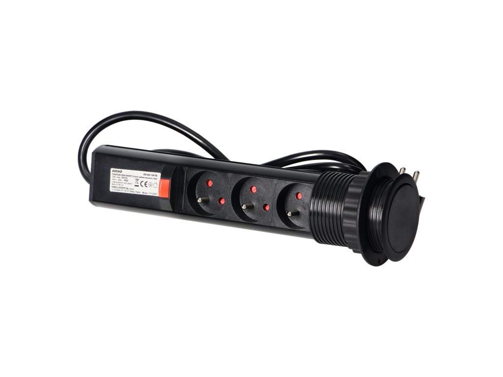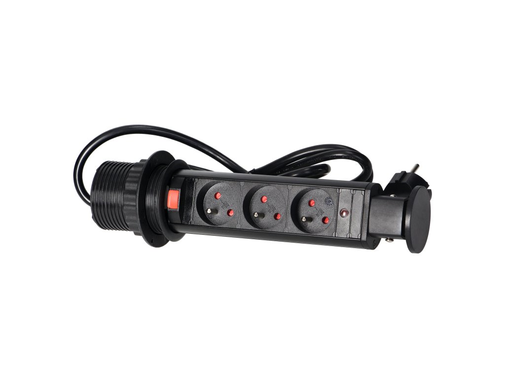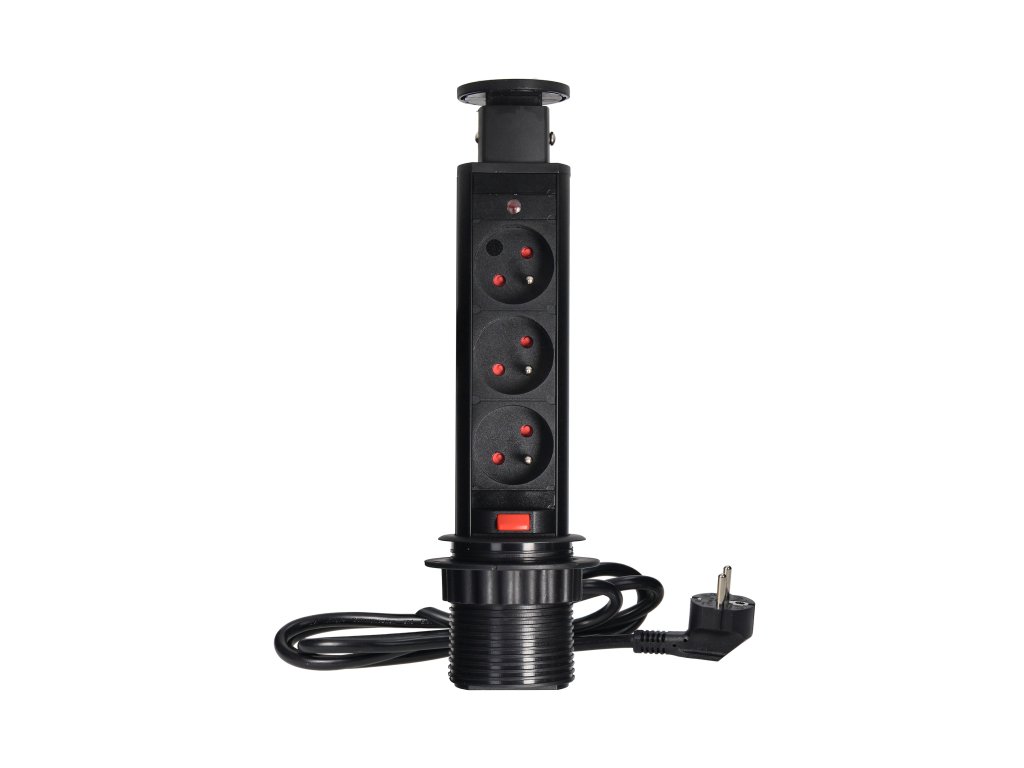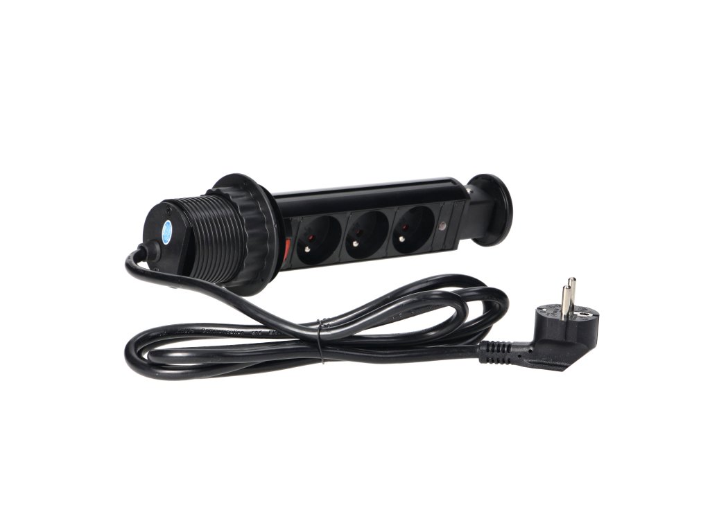 Setul de trei prize electrice 2P+E în carcasă culisantă oferă acces la prizele electrice. Are un panou culisant cu prize, un lacăt adițional și un cablu de 1,8 m lungime. Destinat pentru instalare în interior, pe mese, blaturi și mobilier de birou. Pentru instalarea dispozitivului pe un blat, este suficientă o gaură cu un diametru de 6 cm. Acest produs este fabricat din plastic și metal vopsit negru.Specificații tehnice