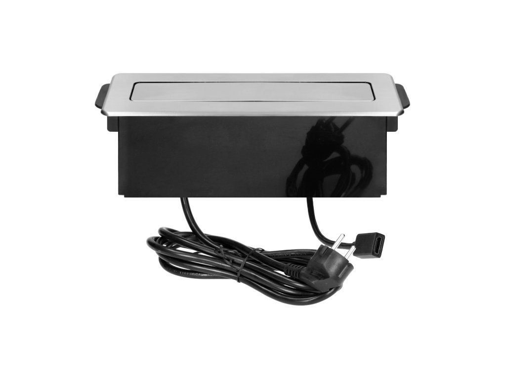 Această elegantă cutie de alimentare pentru mobilier INOX conține două prize de împământare Schuko, două încărcătoare USB (tip A) și un port HDMI. Poate fi încorporată în mese de conferințe, birouri sau mese de bucătărie. Cutia este integrată în suprafața mesei, iar marginea sa plată, frezată, este aproape invizibilă. Această cutie de alimentare se extinde doar atunci când aveți nevoie să conectați un dispozitiv suplimentar. Cablu este de 2 m lungime.Specificații tehnice: