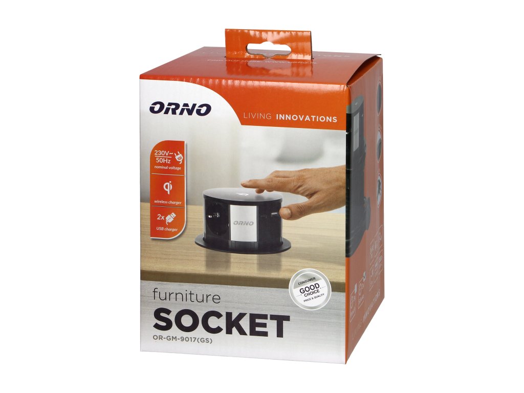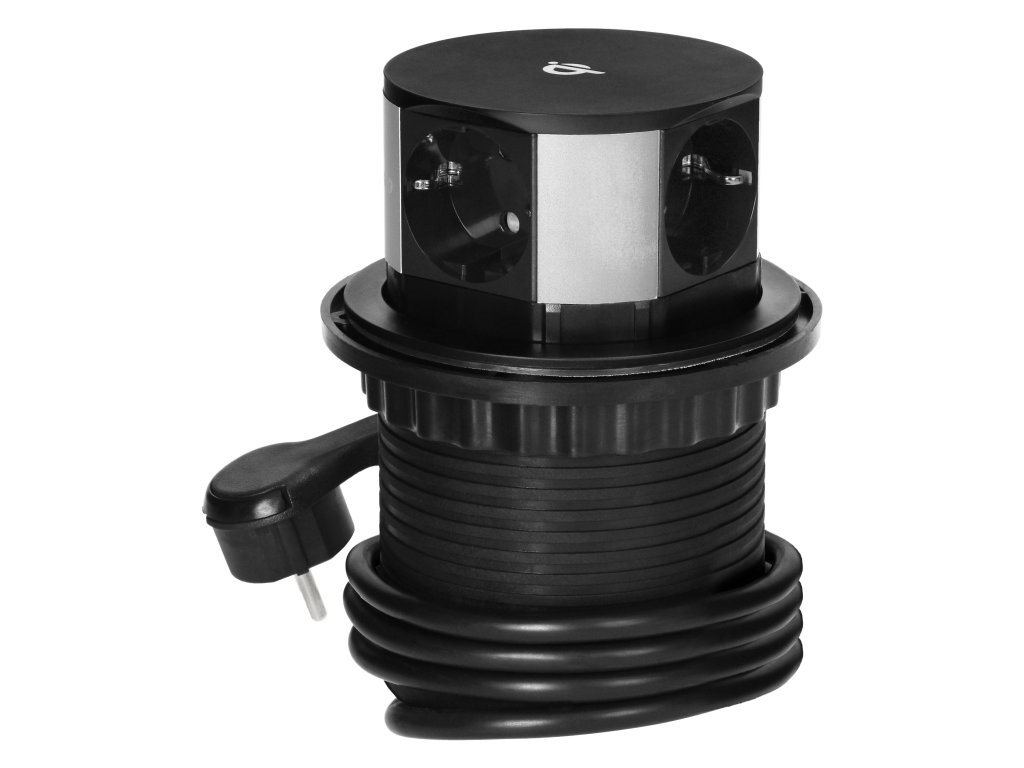 Set de trei prize cu împământare Schuko și protector de curent, conectat la un încărcător USB cu sistem QC 3.0, amplasat în capacul extensibil. În plus, setul include un încărcător cu inducție care permite încărcarea convenabilă fără fir a dispozitivelor externe. Aceste prize sunt destinate instalării în mese de conferință, birouri și blaturi de lucru din bucătărie. Sunt echipate cu un cablu de 1,5 m lungime. Un mecanism precis, la apăsare, extinde automat panoul cu prize. Pentru instalare este necesară o deschidere cu diametrul de 10 cm.Specificații tehnice: