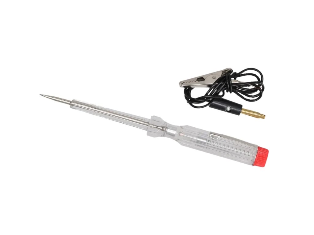 Testerul de tensiune auto este un instrument indispensabil în orice atelier și în trusa de unelte a fiecărui meșter amator. Datorită gamei largi de toleranță a tensiunii, puteți verifica alimentarea sistemelor de 6 V, 12 V și 24 V, cum ar fi motocicletele, mașinile personale și camioanele. Este ideal pentru a verifica funcționalitatea dispozitivelor de siguranță ale vehiculului. Datorită dimensiunilor practice, testerul este ușor de manevrat și se utilizează confortabil. Cablu se conectează la conectorii din spate și se termină cu un crocodil/pin, care se leagă la masă, iar lama testerului este folosită pentru a atinge componentele pentru a verifica dacă sunt alimentate. Becul din mânere oferă informații despre curentul care curge.Caracteristici: