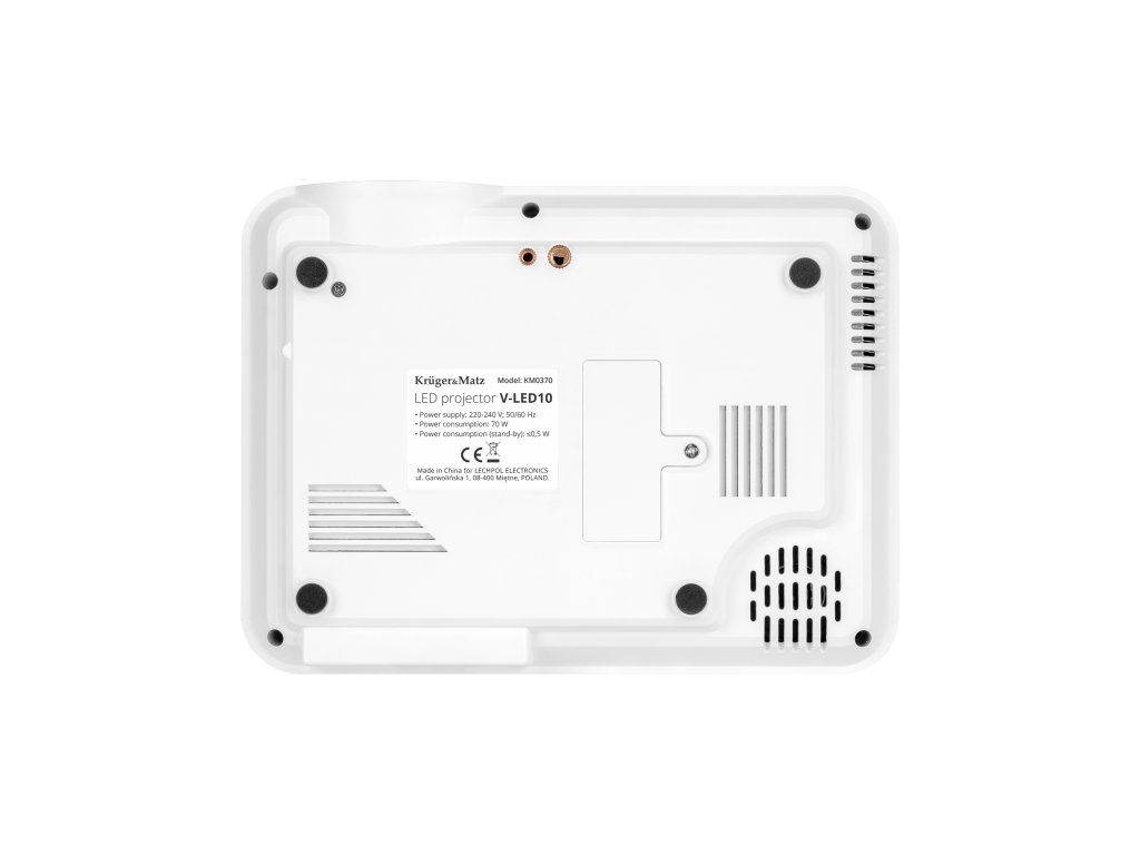 Proiectorul Kruger&Matz V-LED10 vă oferă o gamă largă de opțiuni în ceea ce privește alegerea sursei de redare. Aveți câteva porturi disponibile: HDMI, USB, port VGA și intrare AV. Datorită acestora, puteți conecta un decodor digital, un stick USB, un laptop sau chiar un smartphone. În plus, ieșirea AUX permite conectarea unui set de difuzoare.