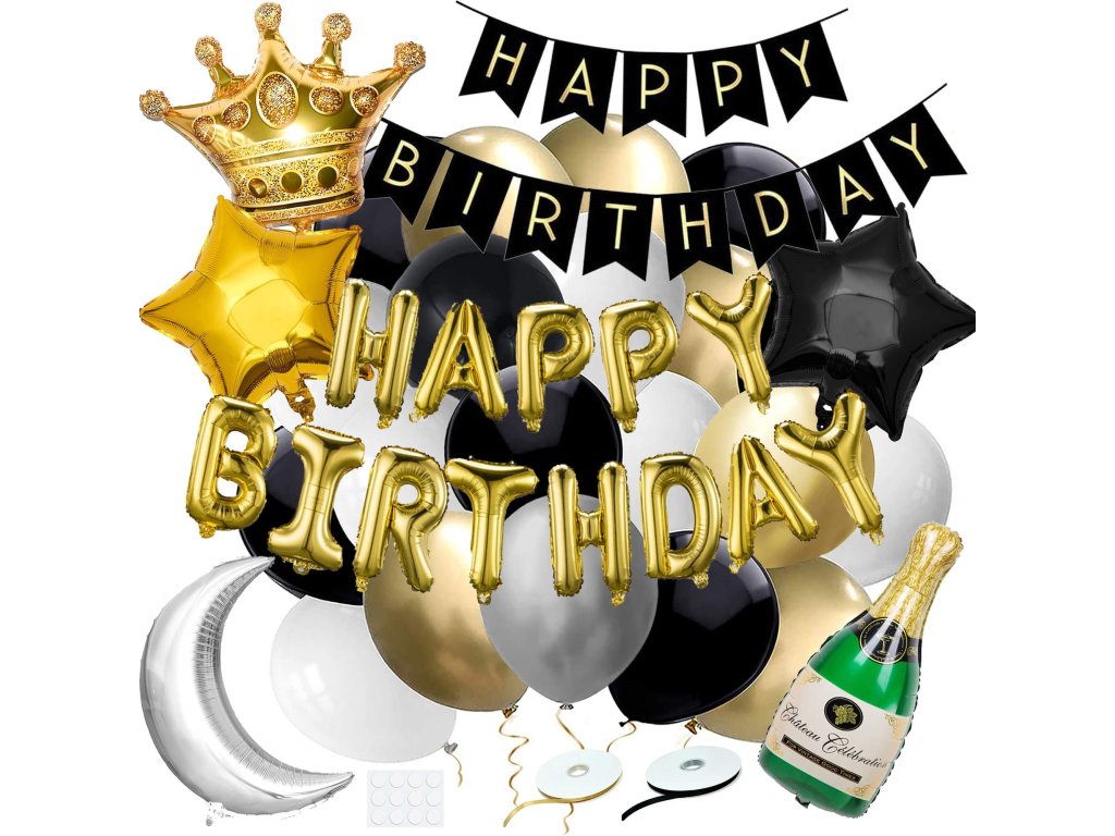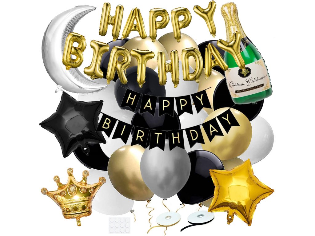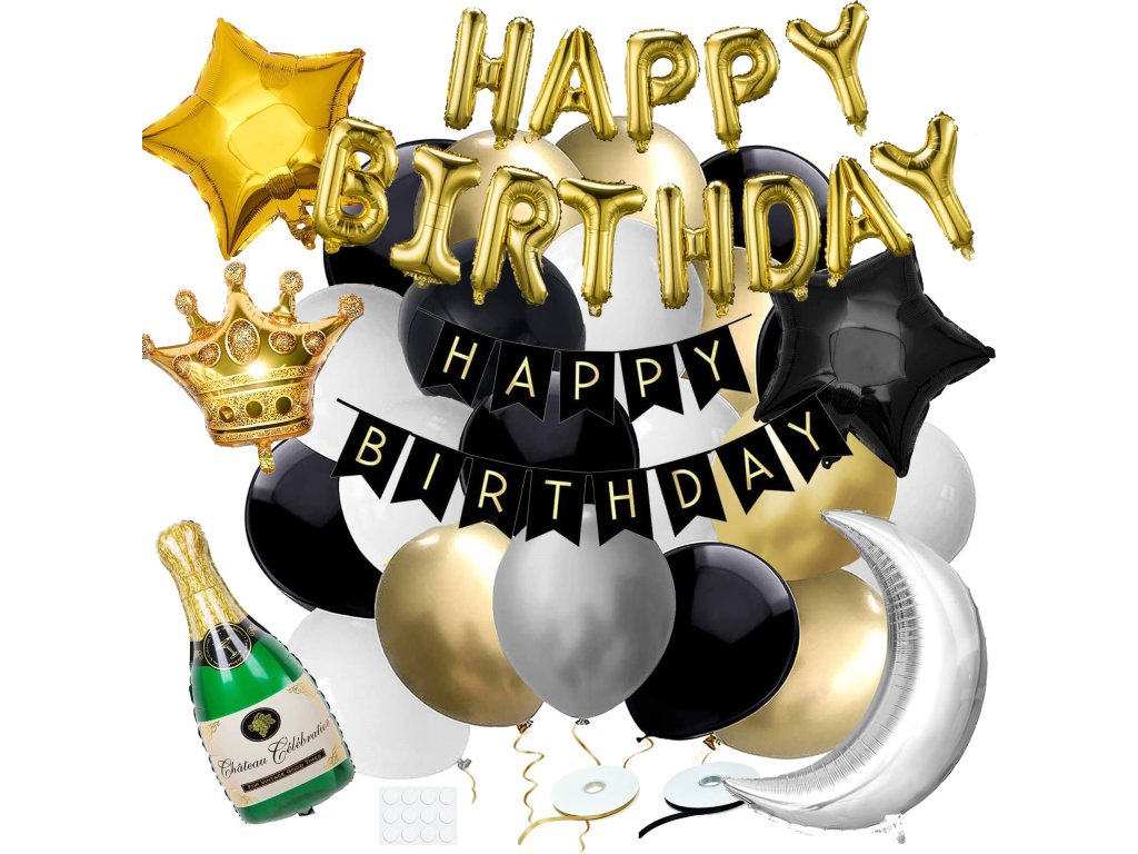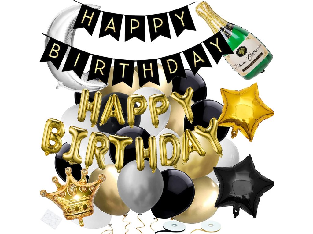 - 1x inscripție aurie "Happy Birthday" 13 litere - înălțime: cca 30 cm