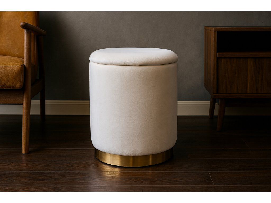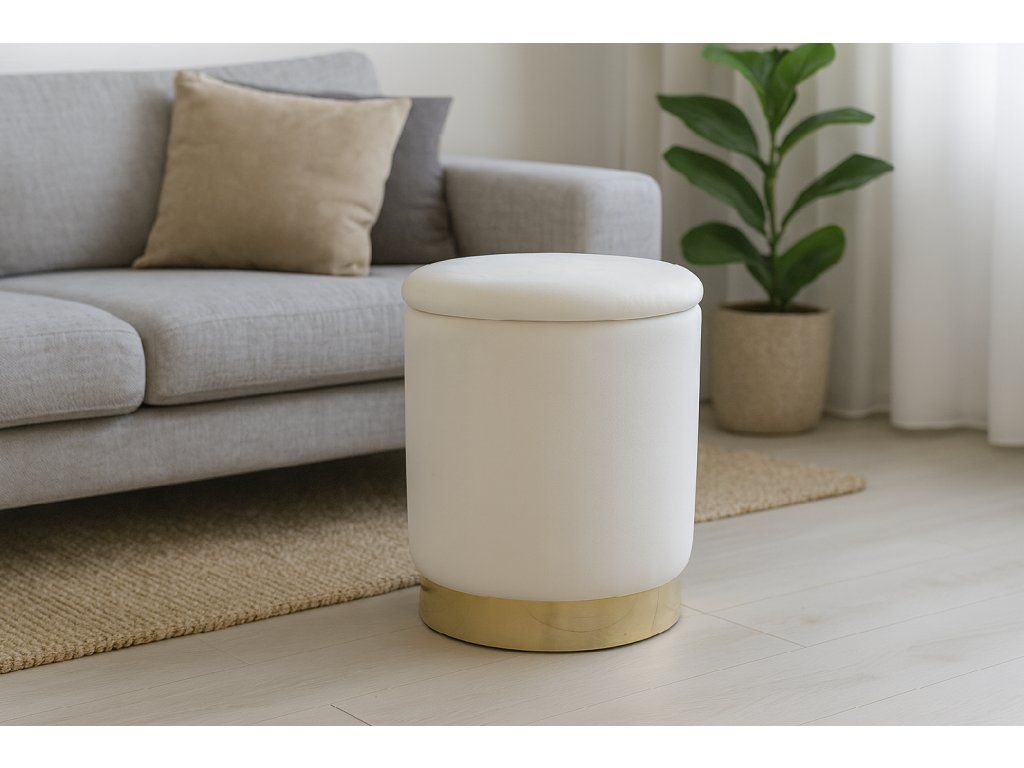 Taburetă rotundă elegantă crema cu margine aurie – ideală ca loc de șezut, suport pentru picioare sau decorativă stilată. Dimensiune compactă 28x42 cm, capacitate de încărcare de până la 80 kg. Design atemporal pentru orice interior.