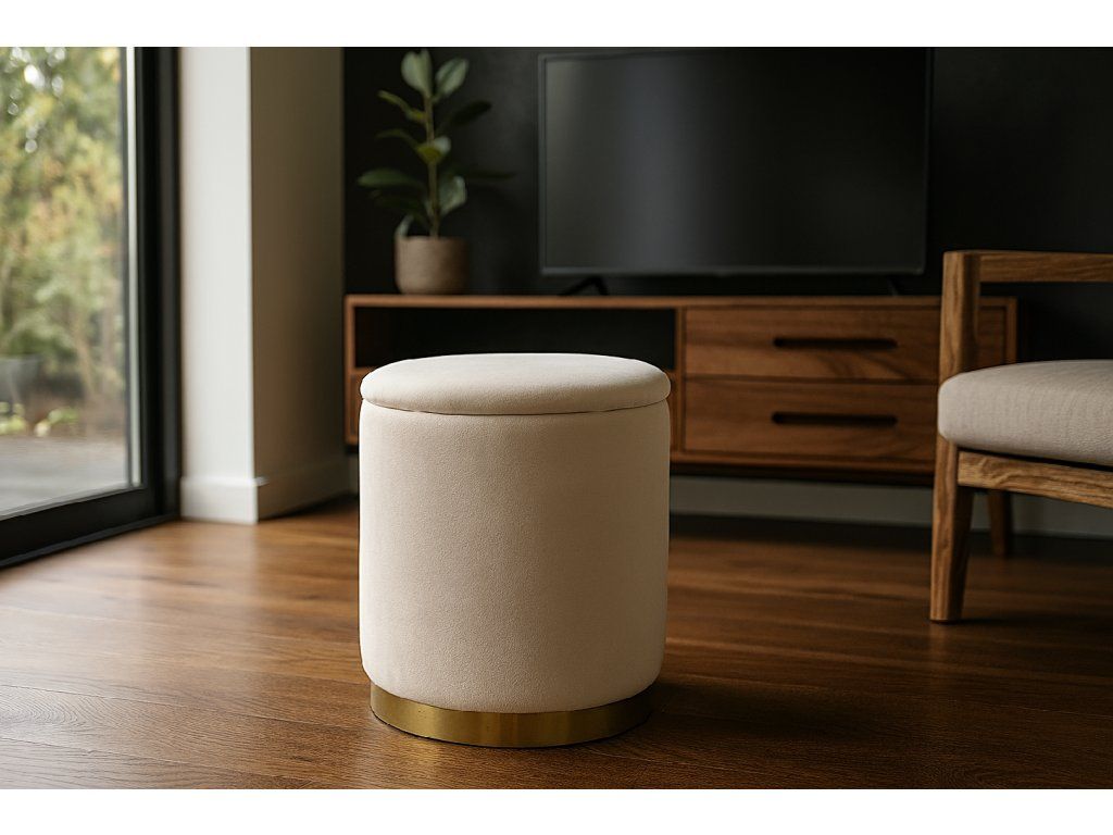 Pufă cremie stilizată cu margine aurie – mică, dar plină de caracter! Ideală ca loc de șezut , footstool sau decorare , datorită dimensiunilor compacte și durabilității de până la 80 kg .
