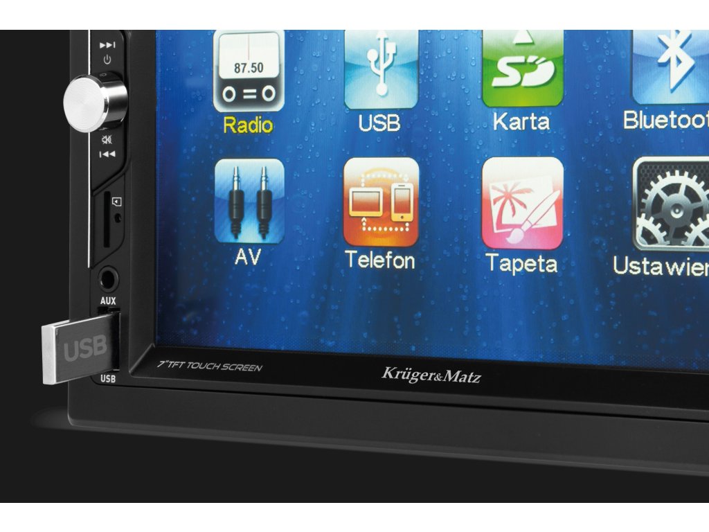 Radio-ul auto Kruger&Matz KM 2007 vă oferă o gamă largă de opțiuni în privința alegerii sursei de sunet și imagine. În afară de funcția Bluetooth, aveți la dispoziție un port UBS, o priză AUX și un cititor de carduri de memorie.