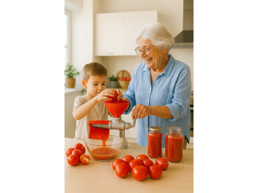Razetă tradițională pentru roșii din fontă și plastic, asigurând stabilitate și confort în utilizare. Posibilitate de prindere de masă pentru o stabilitate mai mare.