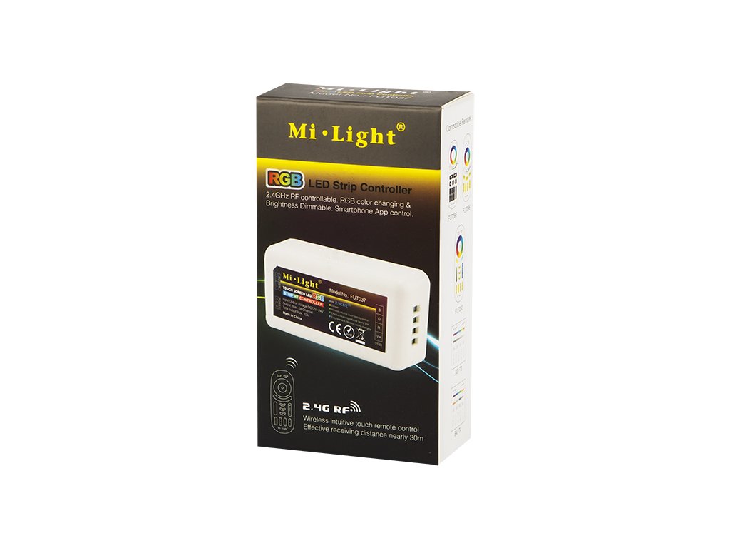 Receptor pentru controlul luminii LED RGB cu o putere de ieșire de 144 W. Receptorul wireless de 2,4 GHz controlat prin radio funcționează cu o telecomandă pe patru zone sau prin modulul Wi-Fi (este necesar un hub Wi-Fi specializat) cu un smartphone sau tabletă. Cu telecomanda se pot controla simultan patru zone LED independente. La o singură zonă pot fi conectate mai multe circuite de iluminat. Culoarea și intensitatea luminii pot fi controlate cu ajutorul telecomenzii și al benzilor LED potrivite. Este necesară conectarea la alimentarea cu LED.