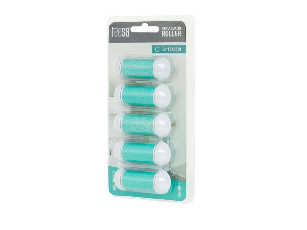 Set de 5 capete de schimb pentru pilă electrică de picioare Teesa TSA0501 îți permite să îngrijești corespunzător picioarele în confortul casei tale. Datorită acestora, pila ta își va menține eficiența originală. Învelișul special din piatră garantează că fiecare dintre rolele pilei Teesa va îndepărta temeinic pielea îngroșată de pe călcâie și tălpi.