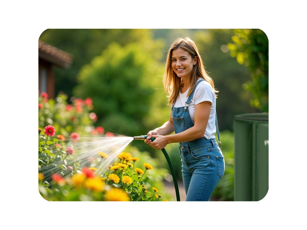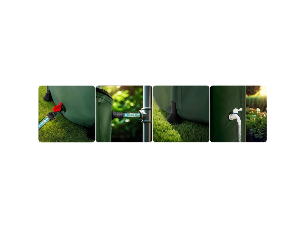 Puteți conecta cu ușurință un furtun de grădină la rezervor, permițând udarea confortabilă a straturilor, gazonului sau plantelor din seră. Astfel, apa de ploaie devine ușor accesibilă în toată grădina, economisind timp și efort.